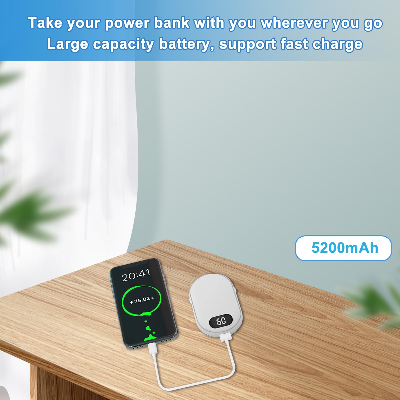 Mit satten 5200mAh Akku-Kapazität hält er deine Hände je nach Einstellung 4-8 Stunden kuschelig warm. Und wenn mal dein Handy schlapp macht, einfach per USB aufladen - praktisch oder?