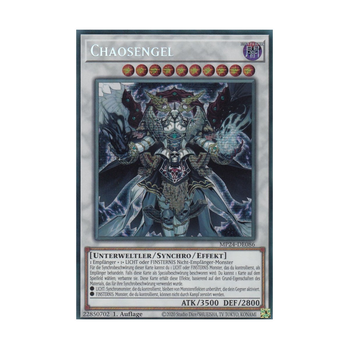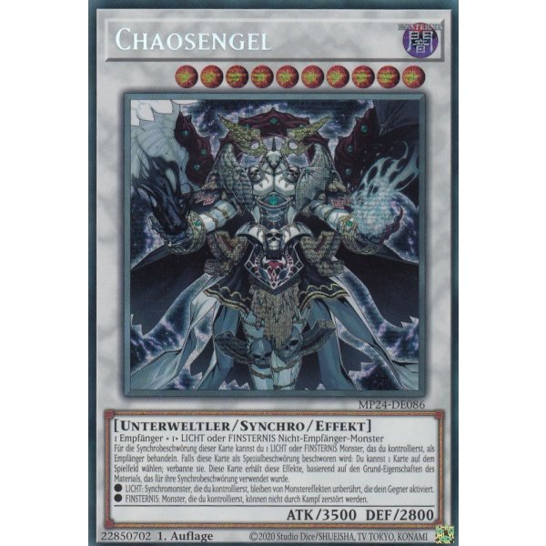 Yu-Gi-Oh Fans, aufgepasst! Hier habt ihr die Chance auf die begehrte Chaosengel Karte in Secret Rare - und das auf Deutsch! Die Karte stammt aus dem 25th Anniversary Tin: Dueling Mirrors und ist in 1. Auflage.\\n\\nDer Zustand ist boosterfrisch - jede Karte wird einzeln kontrolliert, damit du auch wirklich Qualität bekommst. Die Secret Rare-Optik macht diese Karte besonders wertvoll und begehrt.\\n\\nDer Versand ist extra sicher: In einem knicksicheren Toploader aus Recycling-Pappe, made in Germany. So kommt deine Karte garantiert unbeschadet bei dir an.\\n\\nDas Besondere: Der Verkäufer hat über 20.000 weitere Einzelkarten auf Lager - wenn du also noch andere Karten suchst, wirst du hier bestimmt fündig.\\n\\nPerfekt für Sammler und Spieler ab 14 Jahren. Ob für dein Deck oder deine Sammlung - die Chaosengel Secret Rare ist ein echter Hingucker. Schnell zugreifen, denn solche Karten sind schnell weg!