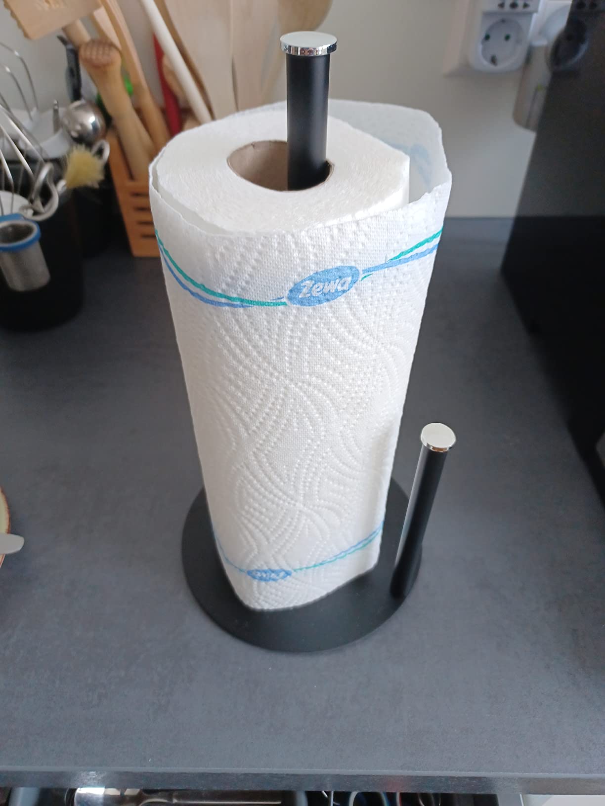 Endlich Ordnung in der Küche! Dieser schwarze Küchenrollenhalter steht einfach auf der Arbeitsplatte - kein Bohren nötig! Die rutschfeste Silikon-Unterseite kratzt nicht und hält bombenfest. Einfach zusammenstecken - in 1 Minute fertig. Die Abdeckung oben verhindert dass die Rolle rausspringt. Passt für Standard- und Großrollen. Sieht modern aus und ist super praktisch. Nicht nur für die Küche - auch perfekt fürs Bad, Büro oder beim Grillen im Garten. Macht deine Küche aufgeräumt und stylisch. Einfach die Rolle drauf und du hast immer ein Blatt griffbereit!