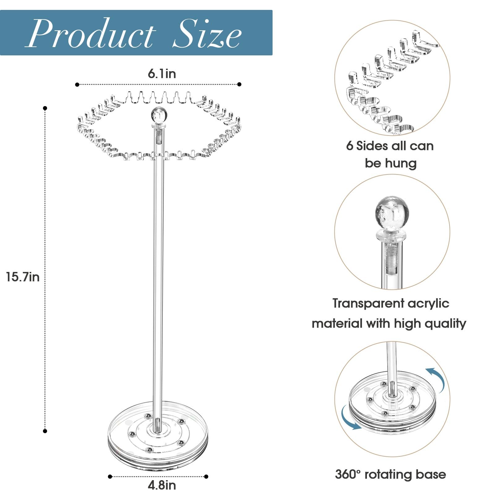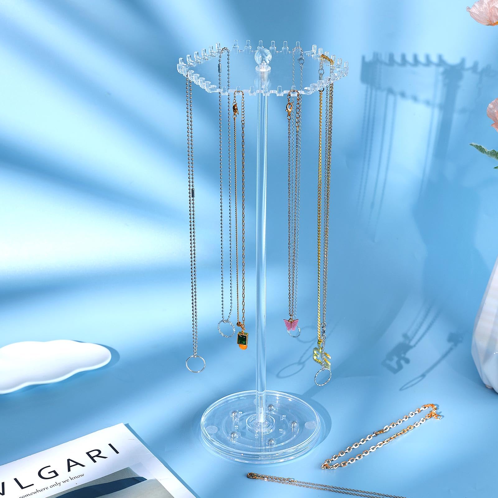 Schmuckchaos adé! Dieser drehbare Acryl-Organizer bringt Ordnung in deine Sammlung. Mit 84 Aufhängeplätzen für Halsketten, Armbänder und mehr. Maße: 32,5x26,9cm - kompakt aber geräumig. Einfache Montage aus nur 3 Teilen in wenigen Minuten. Die 360° drehbare Basis lässt dich alle Stücke bequem überblicken. Aus hochreinem Acryl - elegant und stabil. Perfektes Geschenk für Mutter, Freundin oder Tochter zu jedem Anlass. Endlich alle Schmuckstücke griffbereit und übersichtlich!