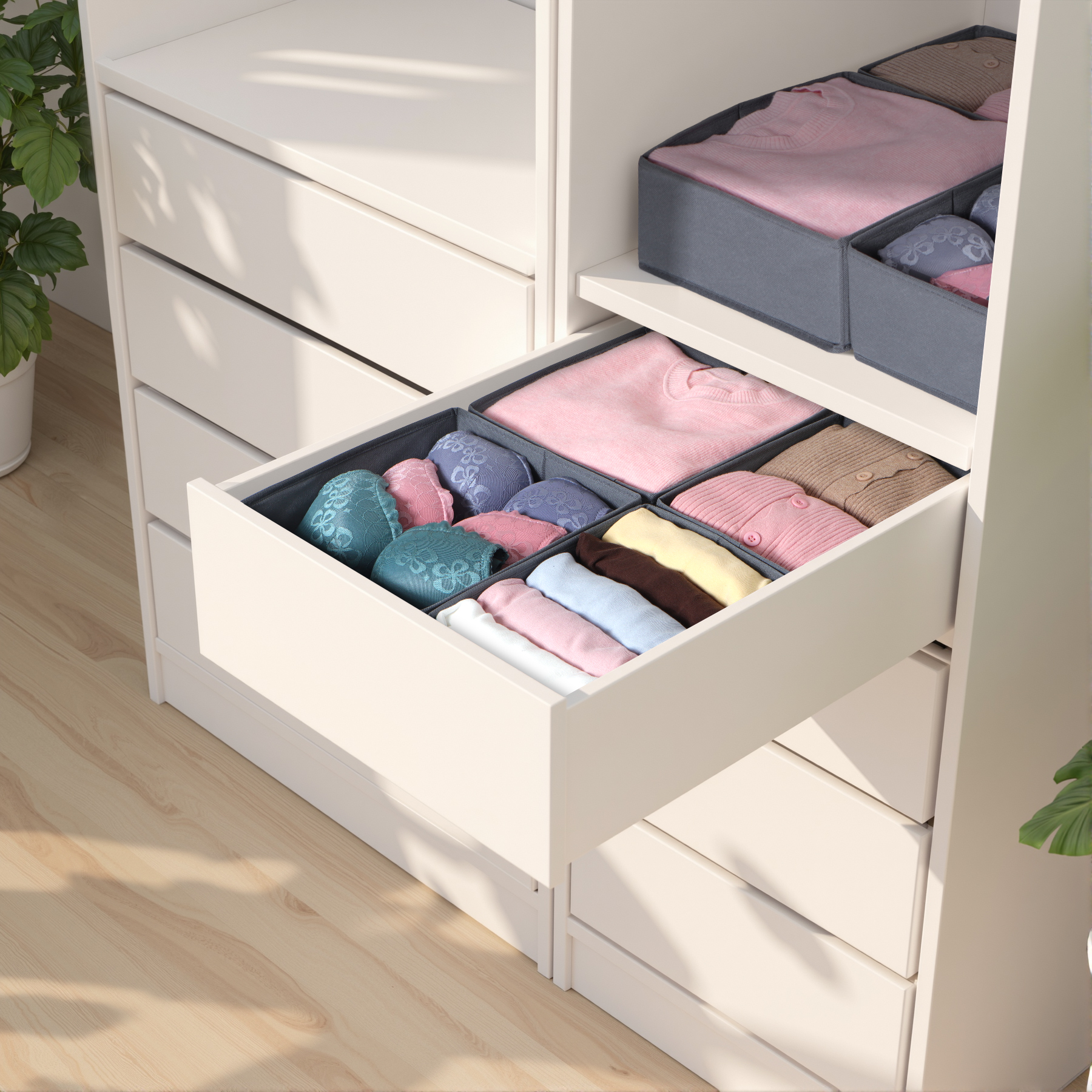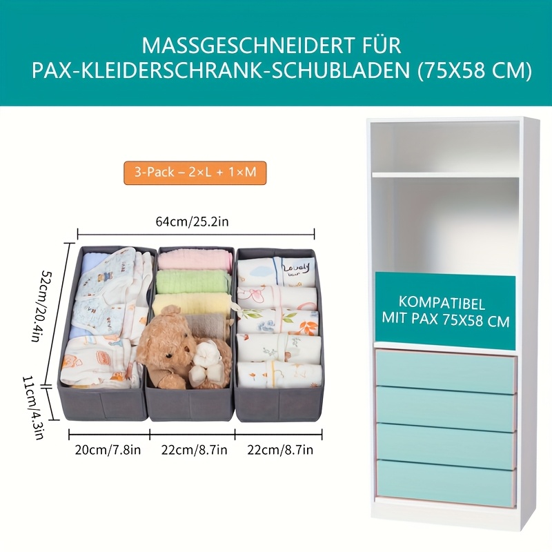 Endlich Ordnung im Kleiderschrank! Diese Yucch Schubladen-Organizer sind speziell für IKEA PAX Schränke gemacht und passen perfekt in die Schubladen. Aus dickem, atmungsaktivem Vliesstoff mit stabilen PP-Platten - viel robuster als Pappe! Die Boxen sind feuchtigkeitsbeständig und geruchsneutral - ideal für Unterwäsche, Socken und Babykleidung. Dank verstärktem Boden knicken sie nicht ein, selbst wenn sie voll mit Jeans sind. Einfach auffalten, Boden einsetzen und sofort losorganisieren! Der kleine Griff an der Seite macht das Herausnehmen super easy. Nie wieder hektisches Suchen am Morgen - alles hat seinen festen Platz! Perfekt für Schlafzimmer, Kinderzimmer oder Flurschrank. Wenn nicht gebraucht, einfach zusammenfalten und platzsparend verstauen. In grau - dezent und passt zu jedem Einrichtungsstil. Macht das Aufräumen zum Kinderspiel und spart jede Menge Zeit!