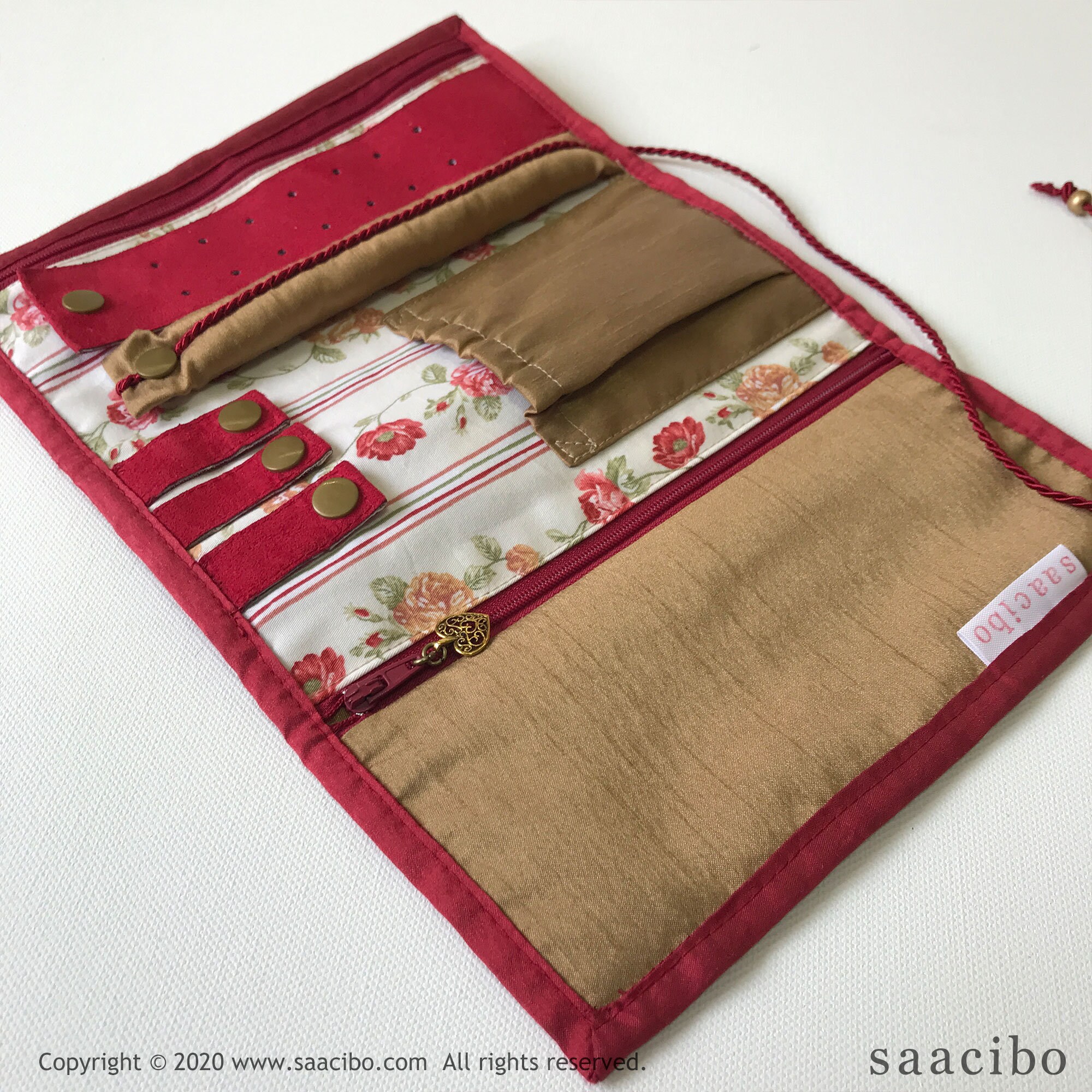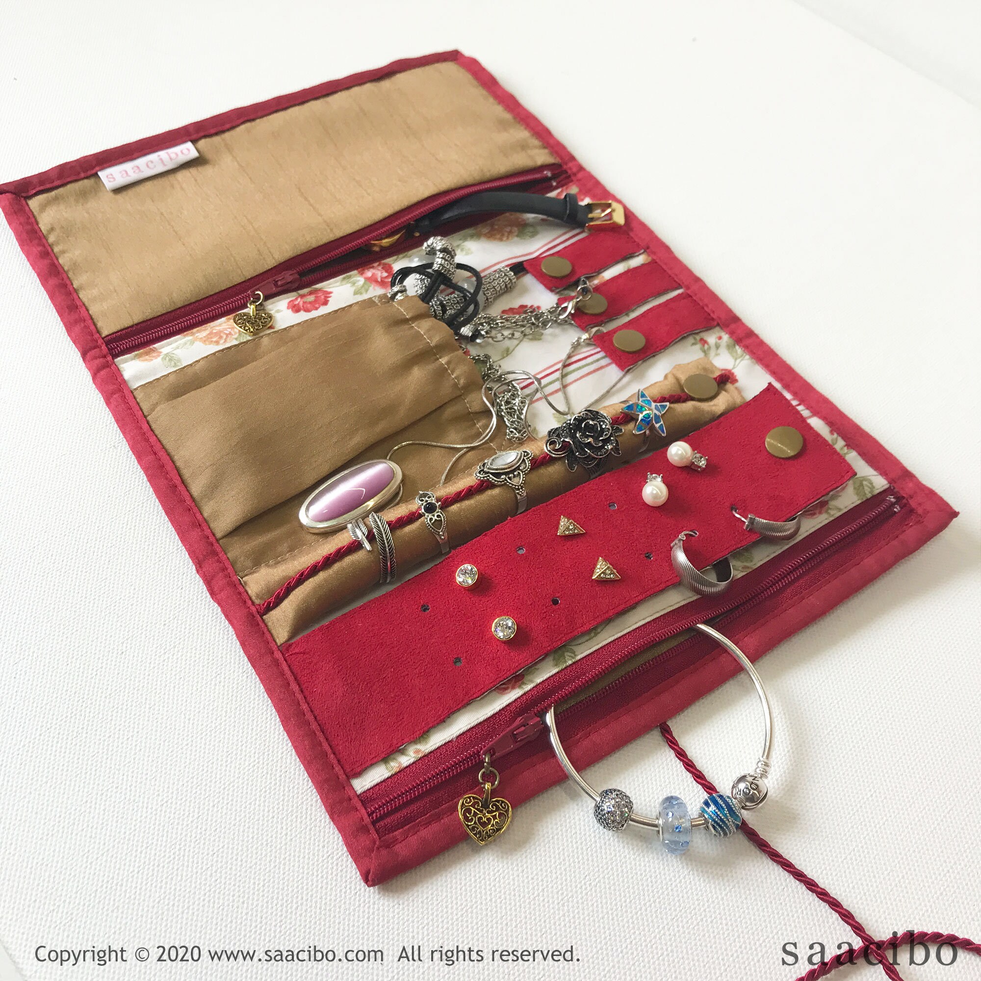 Dein Schmuck verdient den besten Schutz! Diese wunderschöne Schmuck-Rolltasche von Wei Long mit goldenem Bambus-Muster ist nicht nur praktisch, sondern auch ein echter Hingucker. Aus hochwertiger Seide gefertigt - weich, elegant und robust.\\n\\nMaße: Zusammengeklappt 17,5x8,9 cm, aufgeklappt 25,4x8,9 cm. Mit 1 großer Tasche für Ketten, 3 Reißverschlussfächern für Armbänder/Ohrringe und 1 Druckknopfreihe für Ringe.\\n\\nPerfekt für Reisen - platzsparend, leicht und schützt deinen Schmuck vor Kratzern und Staub. Auch als Geschenkverpackung oder für zu Hause super geeignet. Ein luxuriöses Geschenk für besondere Anlässe!