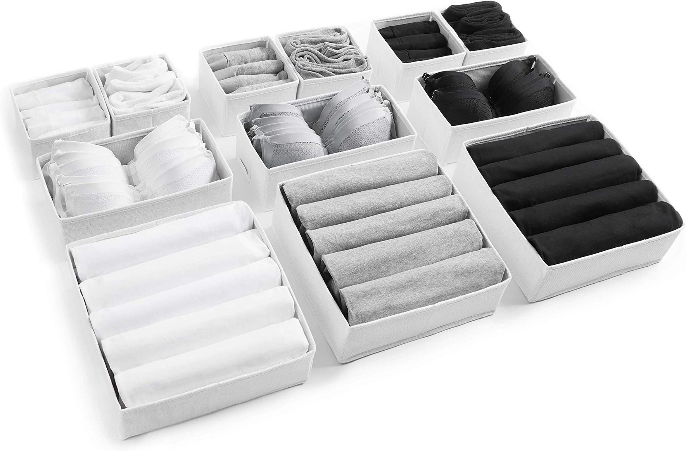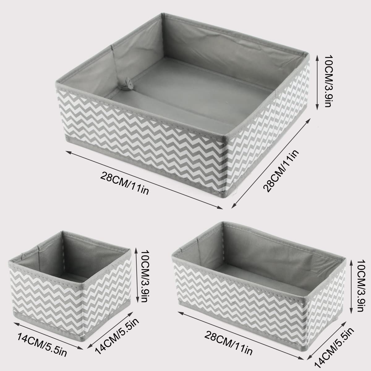 Das Set enthält 12 Boxen in 3 verschiedenen Größen: S (14x14x10cm), M (28x14x10cm) und L (28x28x10cm). So kannst du sie perfekt kombinieren und jede Schublade optimal ausnutzen.