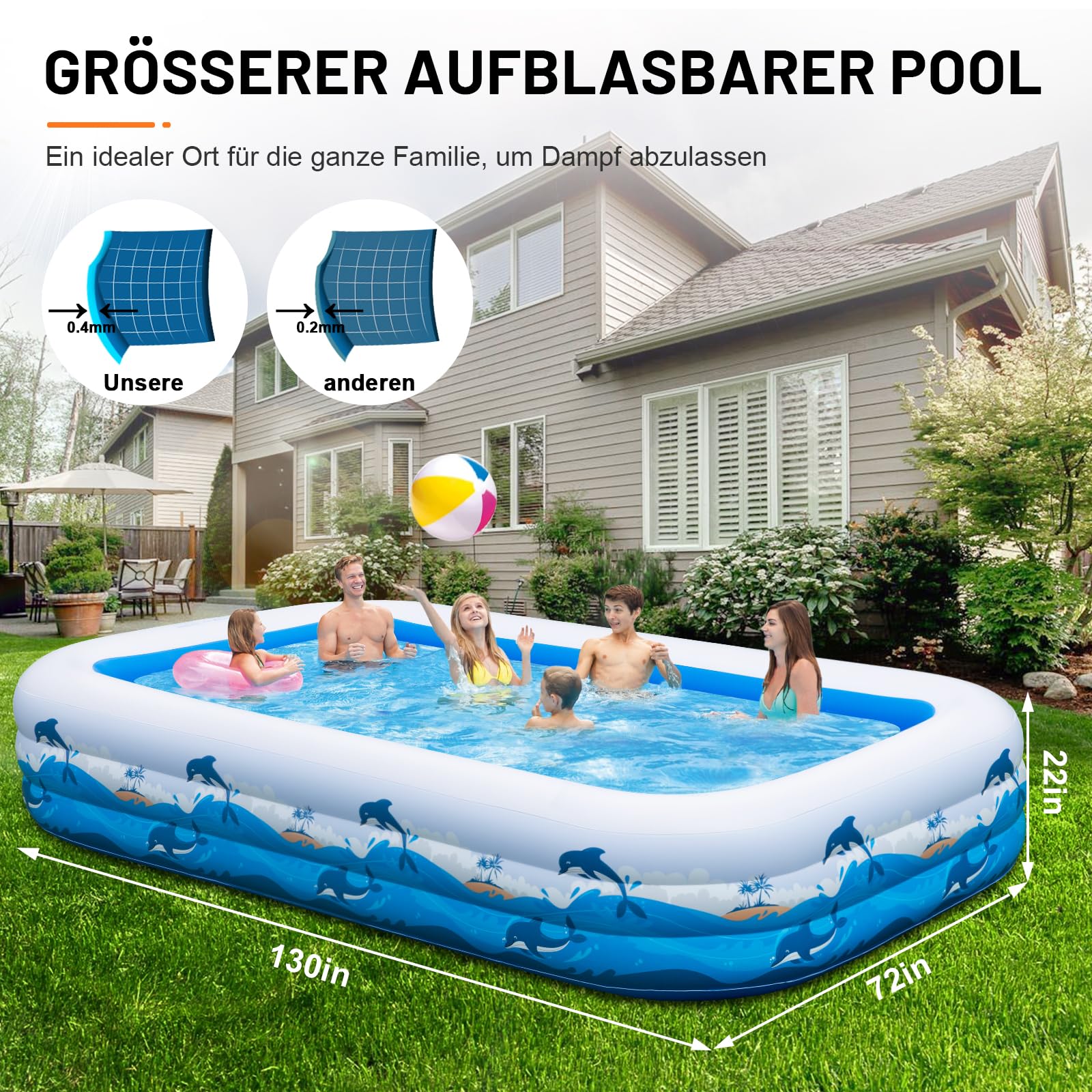 Sommer, Sonne, Badespaß! Dieser coole aufblasbare Pool bringt Urlaubsfeeling in deinen Garten. In verschiedenen Größen von 1,3m bis 3,05m erhältlich - perfekt für Kinder und Erwachsene. Mit Doppelventilen bläst er sich in nur 2-4 Minuten auf (mit elektrischer Pumpe). Das 3-lagige PVC-Material ist UV-beständig und schützt vor Sonnenstrahlen. Der verdickte Boden gibt extra Stabilität. Ob als Planschbecken, Bällebad oder zum Angeln - dieser Pool ist ein echter Allrounder! Einfach aufblasen und losplantschen!