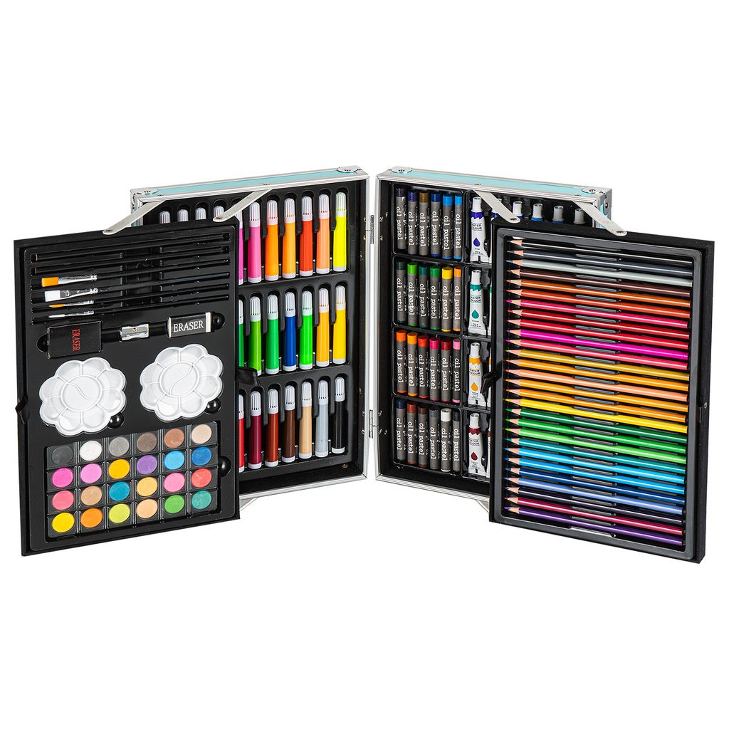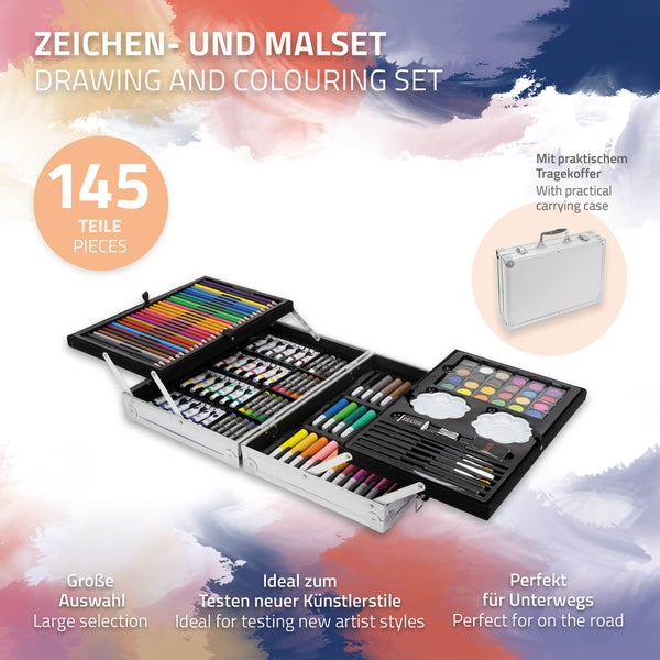 Malen, zeichnen, kreativ sein - mit unserem PAINT BOX 66 Malkoffer im stylischen Holzkoffer! Das umfangreiche 66-teilige Set enthält alles, was junge Künstlerherzen höherschlagen lässt: Buntstifte, Fasermaler, Bleistifte, Wachsmalstifte, Malfarben, ein Lineal, Radiergummi, Anspitzer und sogar eine Quaste. Der Koffer selbst ist nicht nur praktisch, um alles ordentlich zu verstauen, sondern sieht mit seinem dekorativen Holzdesign auch noch toll aus. Perfekt für die Schule, für zu Hause oder zum Mitnehmen im Urlaub. So macht Malen und Zeichnen doppelt Spaß! Ob für Anfänger oder fortgeschrittene Hobbykünstler - hier findet jeder das richtige Werkzeug, um seiner Kreativität freien Lauf zu lassen. Der Koffer schützt die Utensilien vor Beschädigungen und hilft, Ordnung zu halten. Ein fantastisches Geschenk für Kinder und Jugendliche, die gerne basteln und malen. Förder die Kreativität und lass der Fantasie Flügel verleihen - mit diesem komplett ausgestatteten Malset!