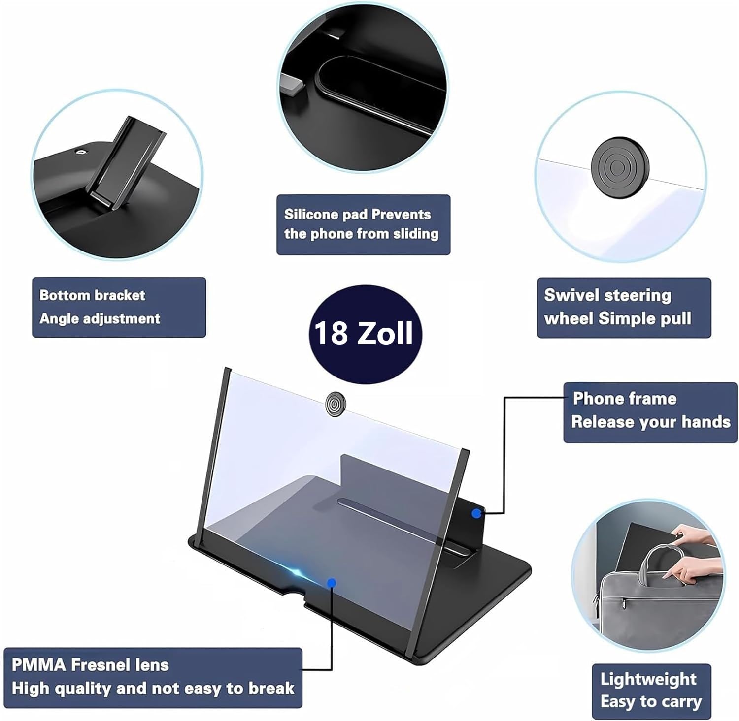 Endlich entspannt Filme schauen und lesen auf dem Handy! Diese 12 Zoll (30,5cm) Display-Lupe vergrößert deinen Smartphone-Bildschirm um ein Vielfaches. Super für Filme, Videos, eBooks oder Spiele - schont die Augen! Die integrierte Handy-Halterung gibt dir freie Hände. Die Linse ist einziehbar - perfekt für unterwegs und platzsparend in der Aufbewahrung. Nur 295g leicht und mit Reinigungstuch inklusive. Einfach Handy in die Halterung, Lupe ausfahren und genießen! Perfekt für Senioren, Kinder oder einfach alle, die gerne entspannt auf größeren Displays schauen wollen. Ein praktisches Gadget für nur 26,3x17,6cm!