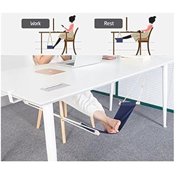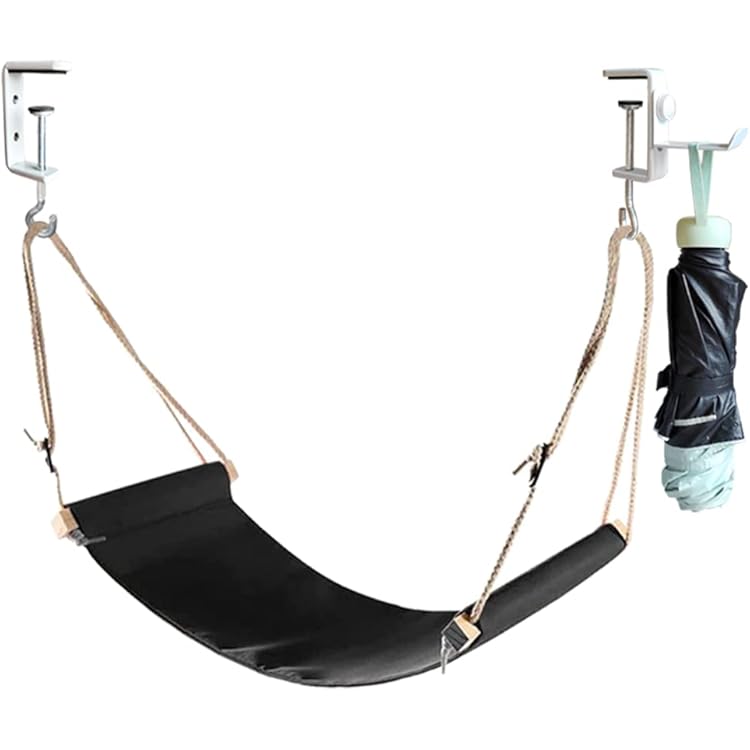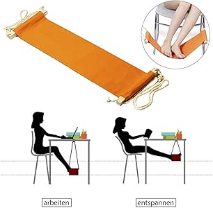 Deine Füße werden dich lieben! Diese geniale Fußhängematte bringt Entspannung pur unter deinen Schreibtisch. Einfach die beiden Winkelhalterungen an der Tischplatte befestigen (passt für Tische bis 2 m Breite und 50 mm Stärke), die Hängematte einhängen und schon kannst du die Beine hochlegen. Die Höhe und Spannung lässt sich ganz einfach über die Kordeln mit arretierbaren Knebel-Knöpfen anpassen. Perfekt für alle, die lange sitzen müssen - ob im Homeoffice, im Büro oder beim Fernsehen. Die Echtholz-Stäbe und die Leinen-Stoffbahn (90% Baumwolle, 10% Polyester) sorgen für natürlichen Komfort. Besonders praktisch für Menschen mit schweren oder anschwellenden Beinen! Die Metall-Halterungen haben Schutz-Gummis, damit dein Tisch nicht zerkratzt. Nach Gebrauch einfach zusammenklappen und platzsparend verstauen. Deine Füße werden's dir danken - probier's aus!