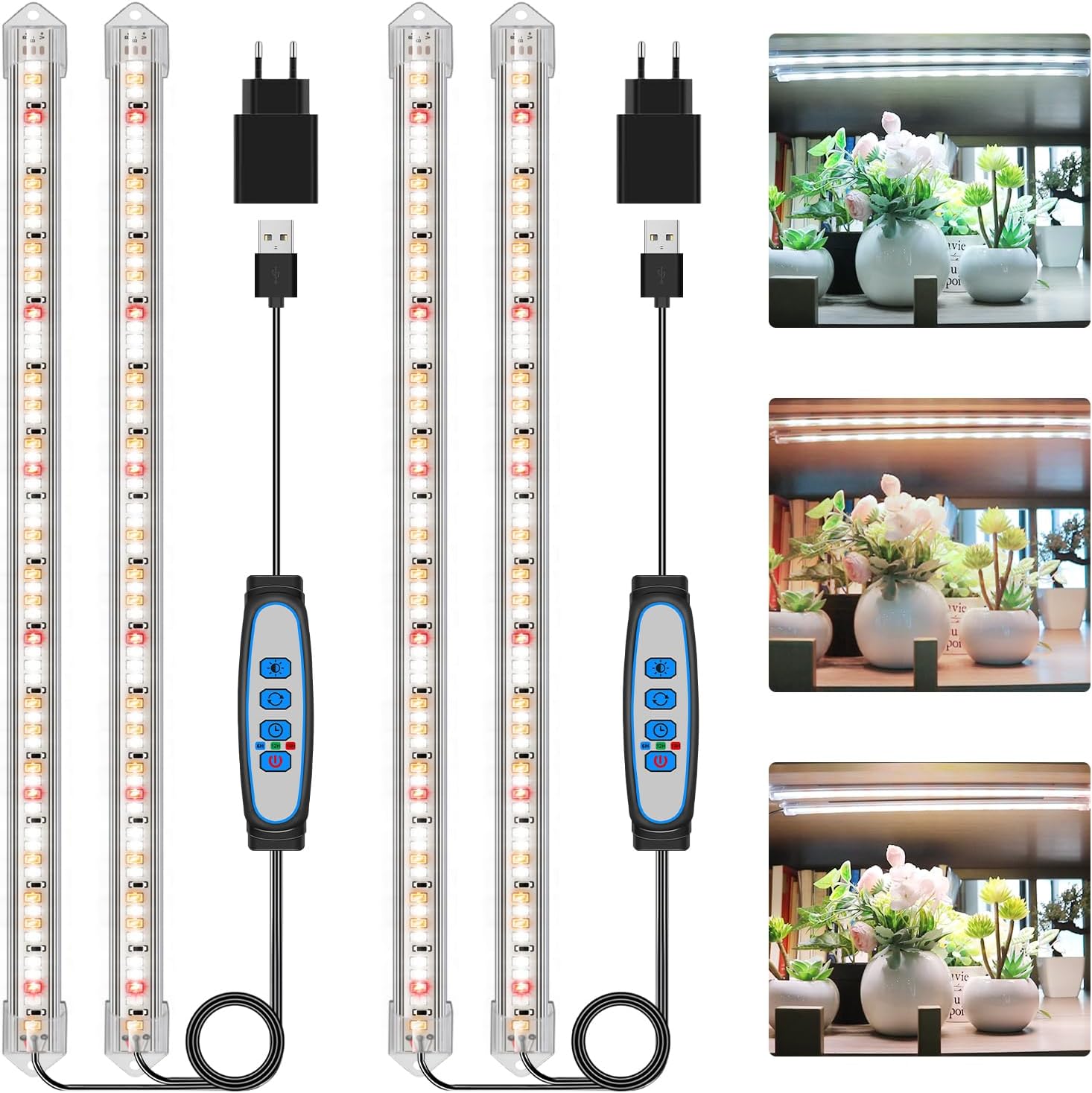 Deine Pflanzen werden's lieben! Dieses Set mit 4 LED-Pflanzenlampen sorgt für perfektes Wachstum - egal ob für Sämlinge, Blüten oder ausgewachsene Pflanzen. Das volle Spektrum simuliert echtes Sonnenlicht und fördert die Photosynthese.\\n\\nDas coole Feature: Die Zeitschaltuhr schaltet sich nach 3, 6 oder 12 Stunden automatisch ab. Musst du nicht dran denken, das Licht auszumachen! Am nächsten Tag geht's dann wieder von alleine los.\\n\\nDie Aluminium-Panels mit 120 LEDs sind 28cm lang und super einfach zu installieren. Mit den mitgelieferten Klebestreifen und Halterungen befestigst du sie an Schränken, Regalen oder Wänden. Und falls mal was sein sollte: 1 Jahr Garantie inklusive! Perfekt für deine Indoor-Gärtnerei.