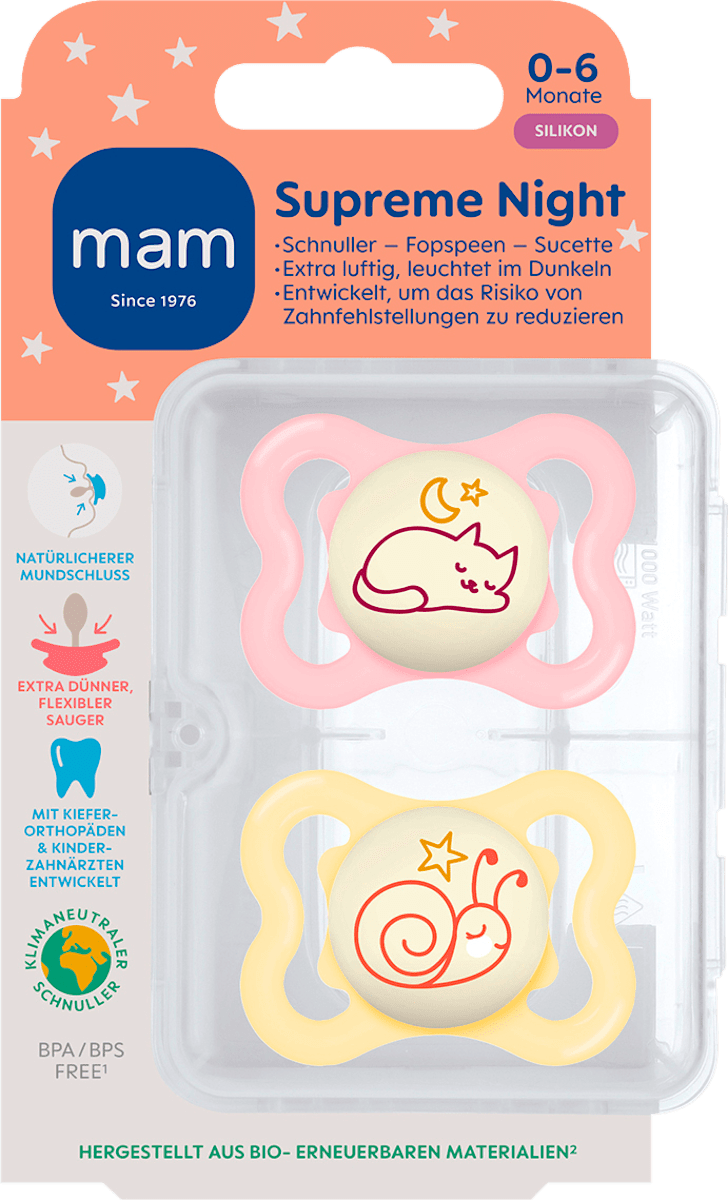 Hey junge Eltern! Dieses MAM Day & Night Schnuller-Set ist einfach perfekt für euer Baby! Im Set sind 4 Schnuller dabei: 2x MAM Original und 2x MAM Night die im Dunkeln leuchten - super praktisch für die Nacht! Hergestellt aus extra weichem SkinSoft Silikon - fühlt sich total sanft im Mund an und wird von 94% der Babys sofort akzeptiert. Das symmetrische Design ist kiefergerecht und liegt immer richtig herum. Die großen Luftlöcher und das abgerundete Schild sind super hautfreundlich. Der flache Greifknopf ist ideal für kleine Babyhände! Und das Beste: Die praktische Box dient gleichzeitig als Sterilisierbox - einfach in die Mikrowelle, kein extra Gerät nötig! Für Babys von 0-6 Monaten, BPA/BPS-frei und entspricht der EN 1400 Norm. In süßen Designs: Bär, Dino oder Mond. Perfektes Geschenk zur Geburt oder für die Baby-Erstausstattung! Euer Baby wird diese Schnuller lieben - und ihr die praktische Handhabung!