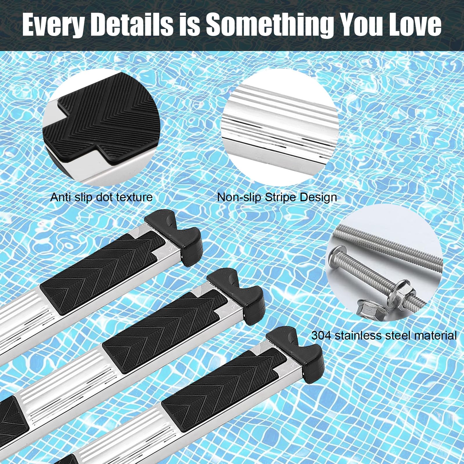 Achtung Pool-Besitzer! Diese Edelstahl-Ersatzstufen sind genau das Richtige für deine Poolleiter. Im 4er-Pack bekommst du alles was du brauchst um deine alte, abgenutzte Leiter wieder fit zu machen. Mit rutschfesten Gummipolstern für sicheren Halt - selbst mit nassen Füßen. Hält bis zu 300 Pfund (ca. 136kg) aus, also auch für kräftigere Personen geeignet. Aus rostfreiem Edelstahl gefertigt - hält dem Chlorwasser stand ohne zu rosten. Die Installation ist super einfach, die Schrauben sind gleich mit dabei. Perfekt für Aufstellpools, Spas oder fest installierte Schwimmbäder. Mach deine Poolleiter wieder sicher und funktional! Ob für den privaten Pool im Garten oder für öffentliche Bäder - diese Stufen machen einfach einen guten Job.