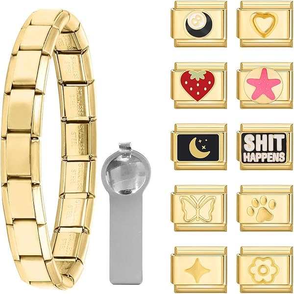 Hey, Lust auf was ganz Persönliches? Mit diesem Italian Charms Armband Set von Paffartt kannst du dir dein eigenes, einzigartiges Armband zusammenstellen! Die 9mm Edelstahl-Glieder in Gold oder Silber sind total hochwertig und liegen super angenehm am Handgelenk. Das Beste: Du kannst die Charms ganz easy austauschen - je nach Laune oder Outfit! Mit den beiliegenden Öffnungswerkzeugen ist das kinderleicht. Ob für dich selbst oder als ganz besonderes Geschenk - hier kannst du deiner Kreativität freien Lauf lassen. Die Armbänder sind nicht nur schick, sondern halten auch ewig. Perfekt um Freundschaft zu zeigen, Erinnerungen festzuhalten oder einfach mal was Neues auszuprobieren. Echt praktisch, dass man das Design immer wieder ändern kann - so wird's nie langweilig!