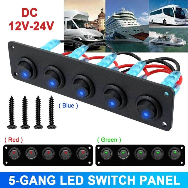 Du willst dein Auto, Boot oder Wohnmobil aufrüsten? Mit diesem coolen 5-Gang Kippschalter-Panel hast du alle wichtigen elektrischen Geräte im Griff!\n\nDas Panel mit blauer LED-Beleuchtung sieht nicht nur mega stylisch aus, sondern ist auch super praktisch. Du kannst damit bis zu 5 verschiedene Geräte steuern - ob Beleuchtung, Lüfter, Pumpen oder was dir sonst noch einfällt!\n\nMit 12-24V Kompatibilität passt das Panel in fast jedes Fahrzeug:\n- Autos und Wohnmobile\n- Boote und Yachten\n- Anhänger und Busse\n- Und vieles mehr!\n\nDas Gehäuse aus Aluminium und ABS-Material ist robust und langlebig. Die mitgelieferten Edelstahl-Schrauben sorgen für eine sichere Montage - nichts wackelt oder löst sich!\n\nBesonders praktisch: Das Panel kann sowohl horizontal als auch vertikal montiert werden. So passt es immer genau dahin, wo du es haben willst!\n\nJeder Schalter kann bis zu 15 Ampere pro Kanal handeln - mehr als genug für die meisten Anwendungen. Und die blaue LED sieht nicht nur cool aus, sondern gibt auch nachts die perfekte Orientierung.\n\nEinfach zu installieren, einfach zu bedienen - was will man mehr?\n\nTechnische Daten:\n- Spannung: 12-24V\n- Strom: max. 15A pro Kanal\n- Beleuchtung: Blaue LED\n- Material: Aluminium + ABS\n- Maße: 165 x 40 x 70 mm\n- Betriebstemperatur: -25°C bis +80°C\n\nLieferumfang:\n- 1x Kippschalter Panel\n- 4x Montageschrauben\n\nPerfekt für alle DIY-Fans, die ihr Fahrzeug individuell ausstatten wollen!