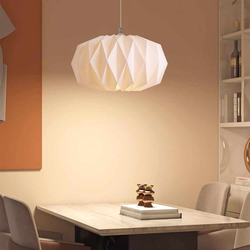 Verwandle dein Zuhause in eine Wohlfühloase mit diesem wunderschönen Papier-Lampenschirm im nordischen Design! Das Origami-Inspirierte Falt-Design erzeugt faszinierende Licht- und Schattenspiele an Decke und Wänden. Hergestellt aus hochwertigem Kunstpapier mit starker Textur - reißfest und langlebig. Einfach an deiner vorhandenen Pendelleuchte aufhängen, keine Installation oder Verkabelung nötig! Die Maße von 22,5x17,5x4,5cm passen perfekt zu den meisten Deckenleuchten. In elegantem Weiß passt der Schirm zu jedem Einrichtungsstil - ob skandinavisch, japanisch oder modern minimalistisch. Das warme, gedämpfte Licht schafft eine gemütliche Atmosphäre in Wohnzimmer, Schlafzimmer oder Essbereich. Wichtig: Nur für Innenräume geeignet und trocken halten. Ein echter Hingucker, der nicht nur Licht spendet, sondern auch als kunstvolles Deko-Element überzeugt!