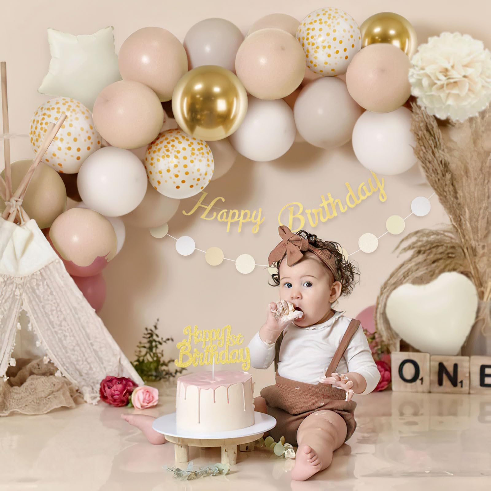 Wow, was für ein tolles Geburtstags-Deko-Set! In Beige, Weiß und Gold - einfach elegant und zeitlos schön! Das Komplett-Set enthält alles, was du für eine perfekte Party brauchst: 45 Latexballons in verschiedenen Größen und Designs (12 Zoll und 5 Zoll), ein hübsches 'HAPPY BIRTHDAY' Banner, eine weiße Gold-Geburtstagsschärpe (160x9,5 cm), 12 goldene Dreiecks-Fähnchen, 2 Pompons (8 Zoll), 10 Meter goldenes Band, einen Cake Topper, eine 16-Fuß-Ballonkette und sogar 3 Punktkleber! Die Ballons sind aus hochwertigem Latex und Goldfolie - ungiftig und sicher! Sie können mit Luft oder Helium gefüllt werden und halten ihre Form super lange! Mit dem mitgelieferten Ballonstreifen und Punktkleber kannst du dir ganz easy eigene Ballongirlanden oder -bögen basteln! Perfekt für Jungen und Mädchen, Männer und Frauen - egal ob 16, 18, 30, 40, 50 oder sogar 100. Geburtstag! Die Deko lässt sich super an Wänden, Fenstern, im Garten oder auf dem Partytisch anbringen! Einfach montieren und sich über die tolle Atmosphäre freuen! Die Kombination aus den verschiedenen Elementen macht die Party wirklich besonders und unvergesslich! Und nach der Feier kannst du viele Teile sogar wiederverwenden! Mehr Party-Feeling geht kaum! Also, wenn du eine Geburtstagsfeier planst und nach der perfekten Deko suchst, dann ist dieses Set genau das Richtige! Einfach bestellen und dich auf eine wunderschöne Party freuen!