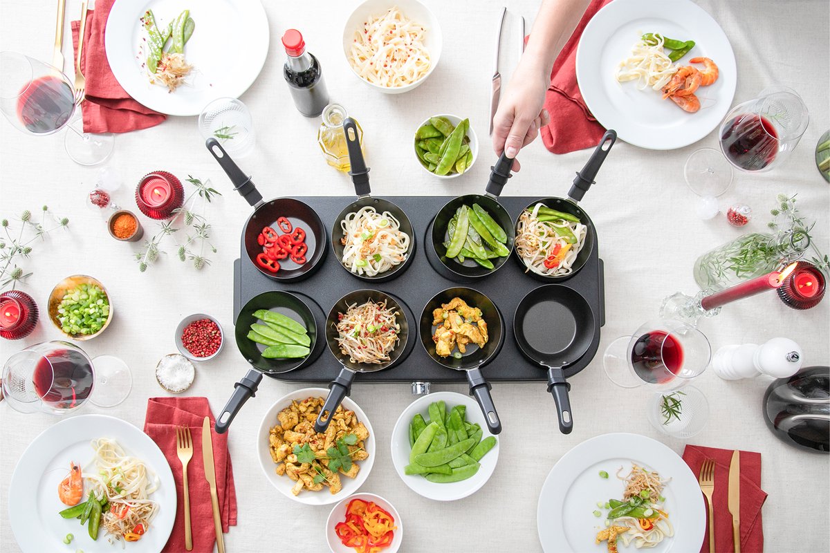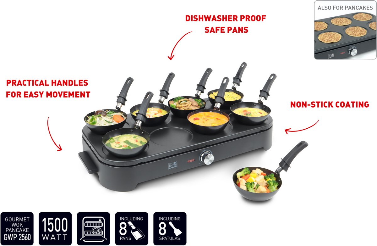 Das ultimative Party-Highlight! Der FRITEL Gourmet Wok Pancake Maker verwandelt jede Feier in ein kulinarisches Erlebnis. Mit 1500W Leistung und stufenlos einstellbarem Thermostat für perfekte Ergebnisse. Enthalten sind 8 Wok-Pfännchen mit Antihaftbeschichtung (15cm Durchmesser) und 8 Spachteln. Super vielseitig: Mach Pfannkuchen, Mini-Pizzen, Wraps, Spiegeleier oder asiatische Wok-Gerichte. Die massive Grillplatte aus Aluminium mit Antibeschichtung ist leicht zu reinigen. Cool-Touch-Griffe sorgen für Sicherheit. Perfekt für 1-8 Personen - ob Familienfeier, Geburtstag oder gemütlicher Abend mit Freunden. PFAS-frei und damit besonders gesundheitsbewusst. Mach deine nächste Party zum unvergesslichen Erlebnis!