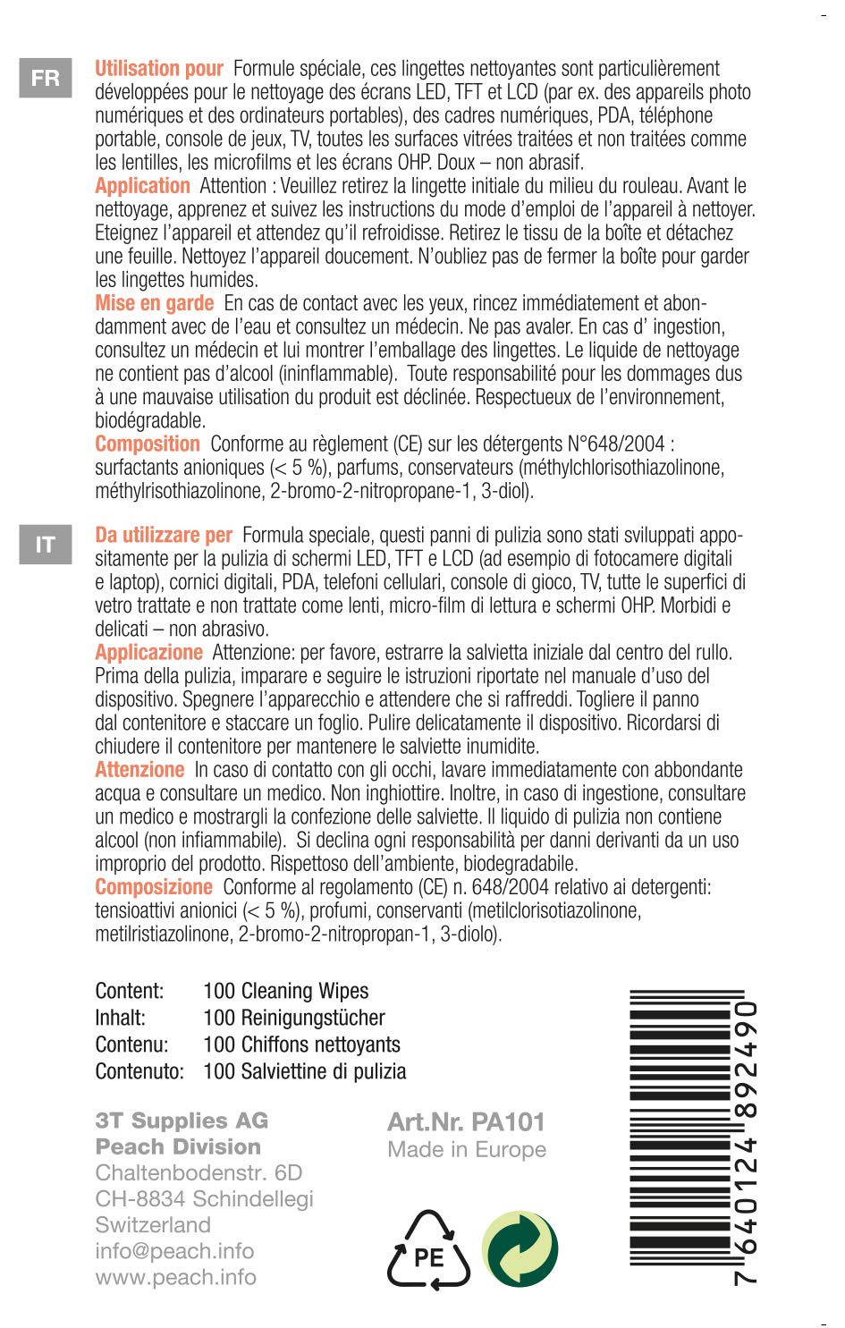 Müde von staubigen Bildschirmen und schmutzigen Tastaturen? 🖥️ Die Peach Reinigungstücher sind deine Rettung! Mit 100 Stück in der praktischen Dose hast du lange Zeit Ruhe vor Staub und Flecken.\n\nDiese Tücher sind der absolute Alleskönner für dein Zuhause oder Büro. Einfach ein Tuch nehmen, drüberwischen und staunen - keine Streifen, nur Sauberkeit!\n\n🌟 Was diese Tücher so besonders macht:\n• 100 Stück in wiederverschließbarer Dose - immer frisch\n• Streifenfreie Reinigung - kein lästiges Nachwischen\n• Biologisch abbaubare Flüssigkeit - gut für die Umwelt\n• Ohne Alkohol - schonend zu allen Oberflächen\n• Antistatische Wirkung - weniger Staubanziehung\n\n💫 Perfekt geeignet für:\n• Laptop- und Computer-Bildschirme\n• Smartphones und Tablets\n• Tastaturen und Mäuse\n• Brillen und Kameraobjektive\n• Autoinstrumente und Armaturenbretter\n• Und so vieles mehr!\n\n🔧 Einfache Anwendung:\n1. Tuch aus der Dose nehmen\n2. Oberfläche abwischen\n3. Trocknen lassen - fertig!\n\nKeine chemischen Gerüche, keine klebrigen Rückstände. Einfach nur strahlende Sauberkeit!\n\nDas Beste: Die Tücher sind unglaublich vielseitig. Ob im Homeoffice, unterwegs oder im Auto - du hast immer die perfekte Reinigungslösung parat.\n\nÜbrigens: Perfect für alle, die Wert auf gepflegte Technik legen! Deine Geräte werden es dir danken! ✨