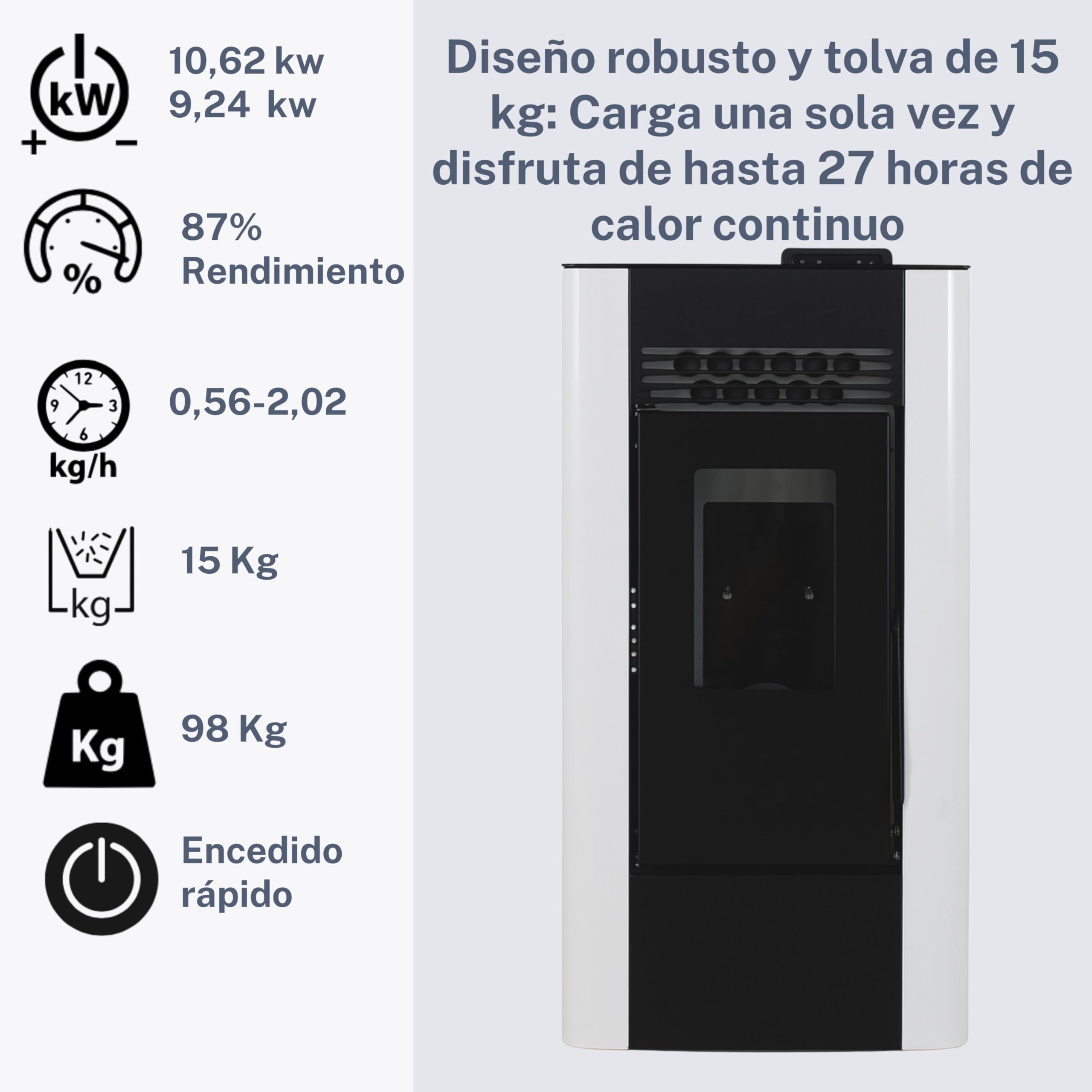 Gemütliche Wärme vom Profi! Der EIDER King 10 heizt dir mit satten 10 kW sogar Räume bis 200 m³ richtig ein. Der große 15 kg Trichter bedeutet: weniger nachfüllen, mehr genießen! Mit Energieklasse A+ und 89,6% Wirkungsgrad ist er super sparsam im Verbrauch (0,60-1,75 kg/h). Das Panoramaglas zeigt dir das knisternde Feuer und die Stahlkonstruktion ist einfach unverwüstlich. Perfekt fürs Wohnzimmer oder als Hauptheizung - und die Installation geht dank durchdachtem Design ratzfatz. Seit über 30 Jahren steht EIDER für Qualität aus Granada! Leistung: 10 kW | Trichter: 15 kg | Verbrauch: 0,60-1,75 kg/h | Energieklasse: A+ | Für Räume bis 200 m³ | Maße: Kompaktbauweise