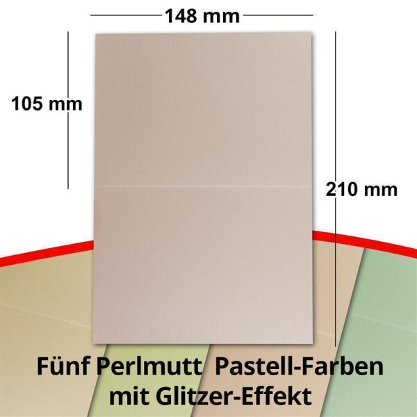 Dieses NEUSER Perlmutt-Kartenset ist einfach wunderschön! 25 Blanko-Karten DIN A6 (10,5x14,8cm) mit passenden Umschlägen in 5 Pastellfarben: hellgrün, gelb, rosa, lila, aprikose. 250g/m² starke Karten mit Perlmutt-Schimmer - perfekt zum Bedrucken oder Basteln. Umschläge 113x160mm, nassklebend. Inklusive hochwertiger Geschenkbox. Ideal für Einladungen, Glückwünsche, Weihnachtskarten. Seit 1915 deutsche Qualität aus der Kartenmanufaktur. Verziere mit Serviettentechnik, Bändern oder Perlen für persönliche Grußkarten die jeden Empfänger begeistern!