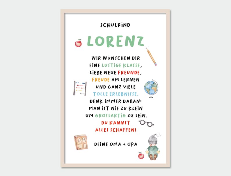 Oh, wie süß ist denn dieses Lernposter für die Einschulung? Personalisiert mit dem Namen deines Kindes - ein ganz besonderes Geschenk. Mit bunten Tieren von A wie Affe bis Z wie Zebra - spielerisch das Alphabet lernen. Zahlen von 1 bis 10 - erste Mathe-Kenntnisse vermittelt. Auf hochwertigem Premium-Kunstdruck-Papier - gestochen scharfe Drucke. In DIN A5, A4 oder A3 erhältlich - such die passende Größe aus. Optional mit Rahmen - gleich aufhängen und dekorieren. Perfekt fürs Kinderzimmer - bunte Wanddekoration die bildet. Als Mutmacher zur Einschulung - gibt Sicherheit und Selbstvertrauen. Einfach Namen eingeben und personalisieren - in wenigen Tagen da. Ob für Jungen oder Mädchen - ein Geschenk das begeistert und lange Freude macht!