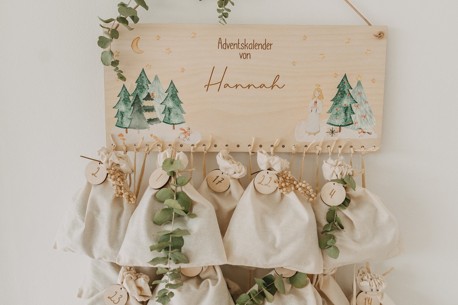 Weihnachtszeit ist Vorfreude-Zeit! Mit diesem personalisierbaren Adventskalender machst du die Wartezeit aufs Fest noch schöner. Du kannst ihn mit Namen oder Motiven individualisieren – alles wird per Laser graviert oder mit kindersicherer Tinte gedruckt. Im Set enthalten: Jutesäckchen, Holzzahlen und Juteschnur zum Aufhängen. Einfach zusammenbauen, mit kleinen Überraschungen füllen und jeden Tag ein Säckchen öffnen. Der Kalender ist aus nachhaltigem Holz gefertigt und kann jedes Jahr wieder verwendet werden. Perfekt für Familien, die gemeinsam basteln und die Adventszeit genießen wollen. Und keine Sorge – im Paket liegt keine Rechnung, falls du ihn verschenken willst. Ein liebevolles Detail, das Kinderaugen zum Strahlen bringt. Jahr für Jahr neu befüllbar – nachhaltig, persönlich und voller Magie!
