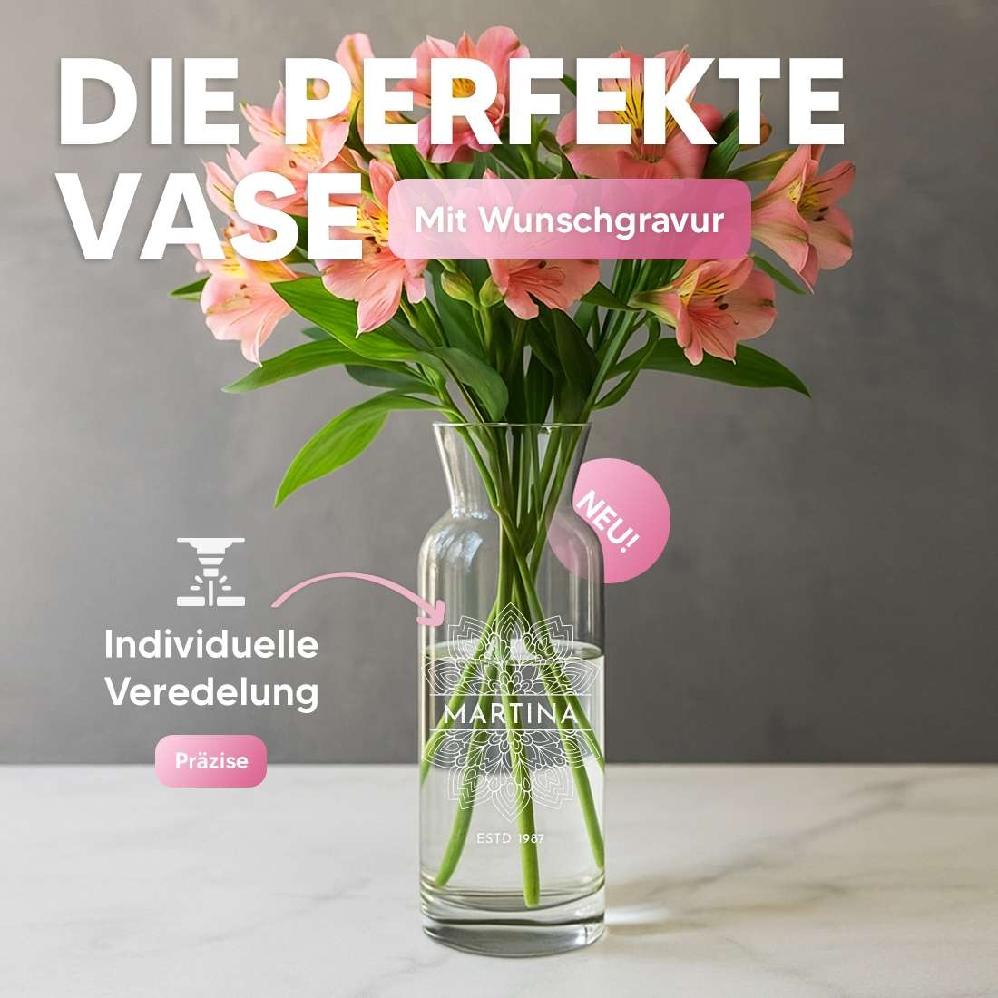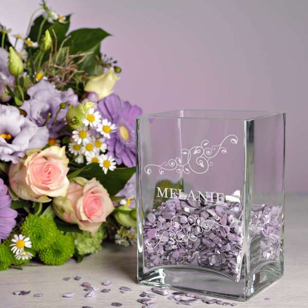 Verschenke etwas ganz Persönliches mit dieser wunderschönen personalisierten Blumenvase! Die elegante Glasvase mit 25 cm Höhe und 9,4 cm Durchmesser wird durch modernste Lasertechnik mit deinem Wunschtext versehen - ob Namen, Initialen, ein besonderes Datum oder eine liebevolle Botschaft. So entsteht ein einzigartiges Erinnerungsstück, das weit über den Anlass hinaus Freude bereitet. Perfekt als Geschenk zur Hochzeit, zum Jahrestag, zur Verlobung, zum Geburtstag oder einfach nur so für deine Liebsten. Die Vase fasst 1260 ml und bietet damit genug Platz für wunderschöne Blumensträuße - ob frische Schnittblumen oder trendige Trockenblumen. Das klare Design fügt sich harmonisch in jede Einrichtung ein, ob modern oder klassisch. Mit einem Gewicht von 820 g steht die Vase stabil und sicher. Ein Geschenk, das von Herzen kommt und bleibende Erinnerungen schafft. Einfach im Bestellprozess deine Wünsche für die Gravur angeben und unser Team setzt sie mit höchster Präzision um. Ob für Mama, Papa, Oma, Opa, Freunde oder Kollegen - diese personalisierte Vase ist immer die richtige Wahl. Langlebig und robust verarbeitet, wird diese Vase zum treuen Begleiter durch die Jahre. Mach deinen Liebsten eine Freude mit einem Geschenk, das wirklich persönlich ist und immer in Erinnerung bleibt!