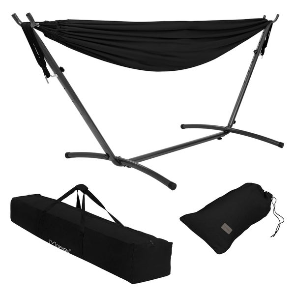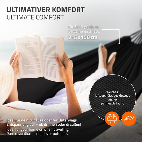 Endlich ne gemütliche Hängematte für zwei Personen! Mit 205x155cm ist die richtig geräumig, hält bis zu 350kg aus. Perfekt für dich und deinen Partner, oder auch alleine mit extra viel Platz. Das Material ist ne Mischung aus Polyester und Baumwolle, angenehm auf der Haut und atmungsaktiv. Mit dabei: zwei Holz-Spreizstangen, die verhindern dass du dich eingerollt fühlst. Die Nylon-Baumbänder sind stark und halten sicher. Aufbau? Einfach! In paar Minuten hängt die zwischen zwei Bäumen, am Gestell oder aufm Balkon. Und wenn du sie nicht brauchst, packst du sie in die mitgelieferte Tragetasche - super für Camping, Strand oder Park. Die Hängematte ist wetterfest, die Nähte sind dreifach verstärkt, also hält die was aus. Selbst nach ner Saison sieht die noch gut aus. Mit anti-rutsch O-Ringen und nem stabilen Gitter-Muster bist du sicher drin. Egal ob du ein Nickerchen machen willst oder einfach nur entspannen - in dieser Hängematte fühlst du dich wie im Urlaub. Einfach reinsetzen, zurücklehnen und die Seele baumeln lassen. Dein neuer Lieblingsplatz im Freien wartet!
