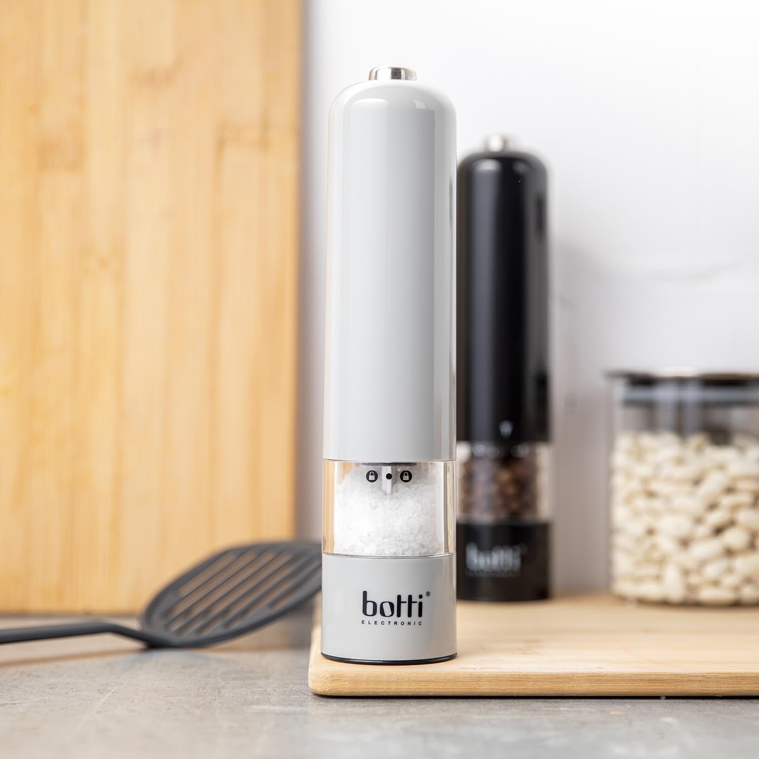Würzen war noch so easy! Die Botti Sorento Mühle mahlt Salz, Pfeffer und andere Gewürze auf Knopfdruck - nein, auf Kippdruck! Einfach um 180 Grad neigen, schon mahlt sie los. Mit einstellbarer Mahlstärke und LED-Licht fürs präzise Dosieren. Keramikmahlwerk, überhitzt die Gewürze nicht - Geschmack bleibt top! Großer Vorratsbehälter, kaum Nachfüllen nötig. In weiß, modernem Design. Einfach abwischbar. Perfekt für alle, die's praktisch und gut aussehend mögen.