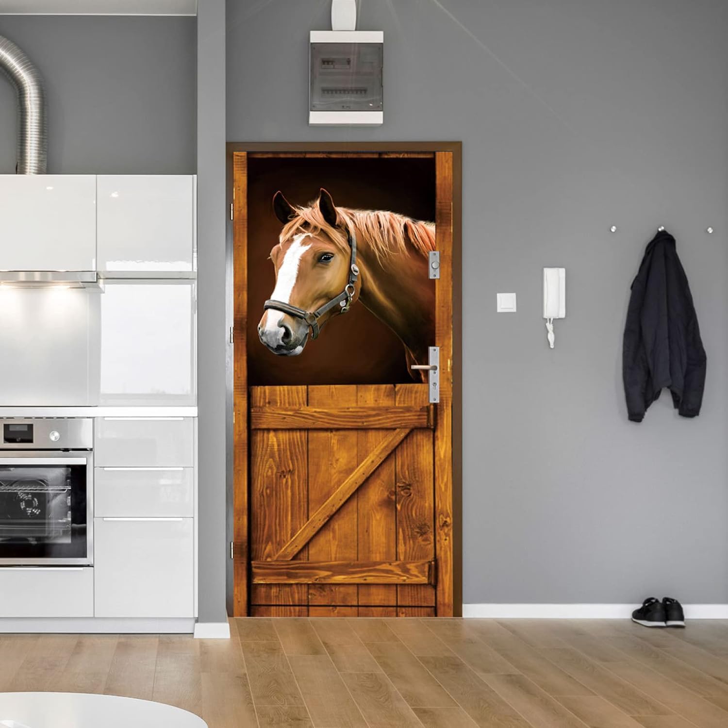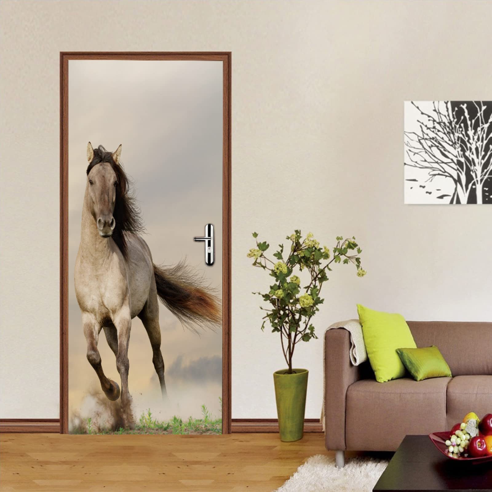 Verwandle deine langweilige Tür in ein Kunstwerk! Dieser riesige 3D Pferd-Aufkleber mit 90x200cm macht aus jeder Tür einen echten Hingucker. Der realistische 3D-Effekt ist so täuschend echt, dass deine Gäste zweimal hinschauen werden.