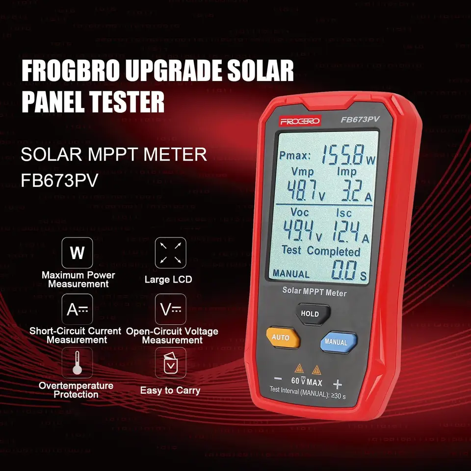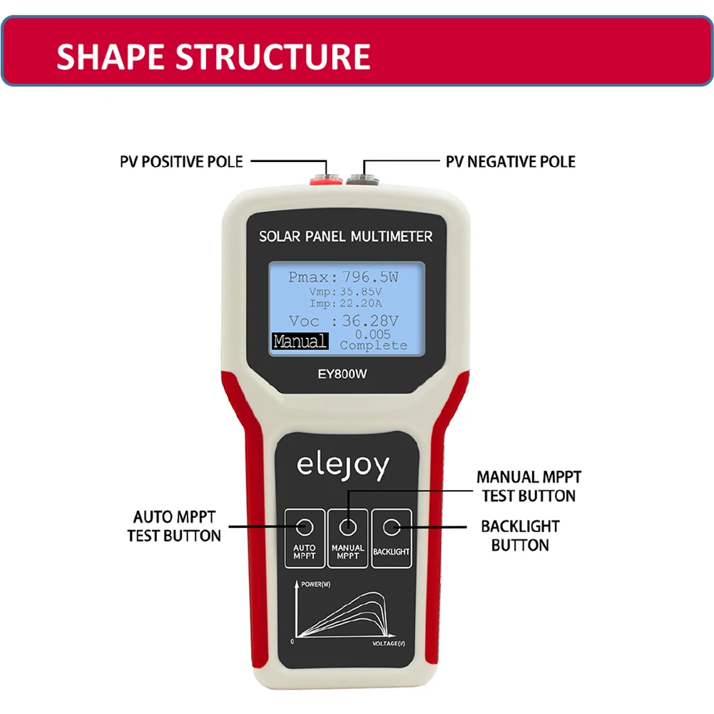 Perfekt für alle Solar-Fans! Dieses professionelle Photovoltaik-Multimeter EY800W zeigt dir genau, was deine Solarpanels leisten. Misst Leistung bis 800W, Spannung von 12-60V und Strom bis 35A. Das LCD-Display mit Hintergrundbeleuchtung ist auch bei Sonne gut ablesbar. Besonders praktisch: Automatische und manuelle MPPT-Erkennung für den optimalen Leistungspunkt. Und mit VOC-Taste siehst du sofort die Leerlaufspannung. Vollgepackt mit Schutzfunktionen - Überspannung, Übertemperatur, Überstrom und Verpolungsschutz. Wird direkt vom Solarpanel versorgt, also keine extra Batterien nötig. Im Lieferumfang: Multimeter, Photovoltaik-Anschlussleitung, Krokodilklemmen und Werkzeugsatz. Ob für die Überprüfung bestehender Anlagen oder beim Aufbau neuer Systeme - damit hast du immer die Kontrolle über deine Solarleistung!
