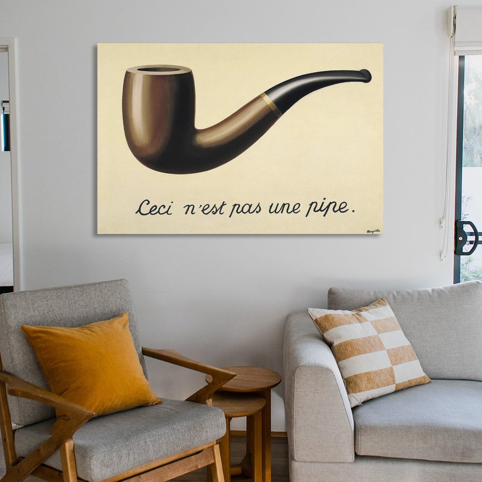 Kunst für deine Wände! Dieser hochwertige Leinwanddruck des berühmten Magritte-Gemäldes 'Ceci n'est pas une pipe' bringt surrealistische Eleganz in dein Zuhause. Mit 70x110 cm ist das Bild ein echter Hingucker im Wohnzimmer, Flur oder Büro. Gedruckt auf strapazierfähigem Canvas-Material, das wasserfest ist und nicht verblasst. Die Farben sind super kräftig und lebensecht - da freut sich jedes Kunstliebhaber-Herz! Ohne Rahmen geliefert, damit du dir selbst deinen Lieblingsrahmen aussuchen kannst. Der weiße Rand von 1-2 cm macht das Einrahmen besonders einfach. Perfekt als Geschenk für Kunstfans oder zur Aufwertung der eigenen vier Wände. Jedes Exemplar wird vor dem Versand geprüft, damit auch wirklich alles perfekt ankommt. Einfach aufhängen und an den klugen Kunst-Sinnspruch erfreuen!
