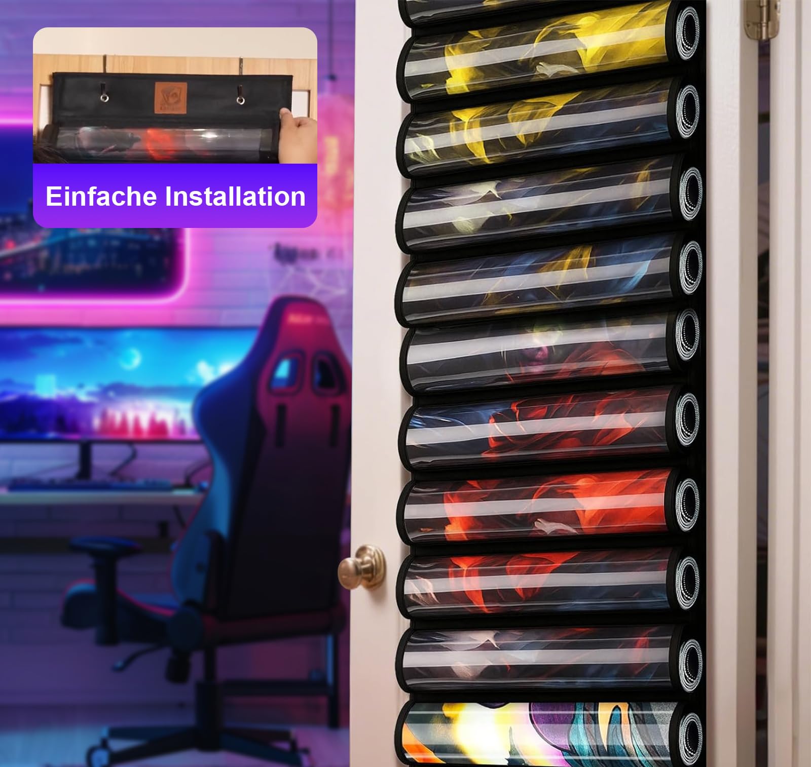 Deine Magic- oder Pokémon-Spielmatten liegen überall rum? Dieser coole Playmat-Holder bringt Ordnung in dein Spielzimmer! Die Tasche hat Platz für ganze 11 Spielmatten plus eine extra Röhre. Mit 98x36,8 cm ist sie groß genug für Standard-Matten (60x35 cm) und passt zu Matten bis 65 mm Durchmesser sowie Röhren bis 7,2 cm. Die zwei robusten Haken machen das Aufhängen an Wand, Tür oder Regal super einfach. Aus strapazierfähigem Stoff genäht, hält die Tasche auch bei häufigem Gebrauch was aus. Das durchsichtige Fenster zeigt dir sofort, welche Matte wo ist. Perfekt für zu Hause oder für Turniere - so bleiben deine Matten sauber, geschützt und immer griffbereit. Endlich kein Suchen und Kramen mehr!