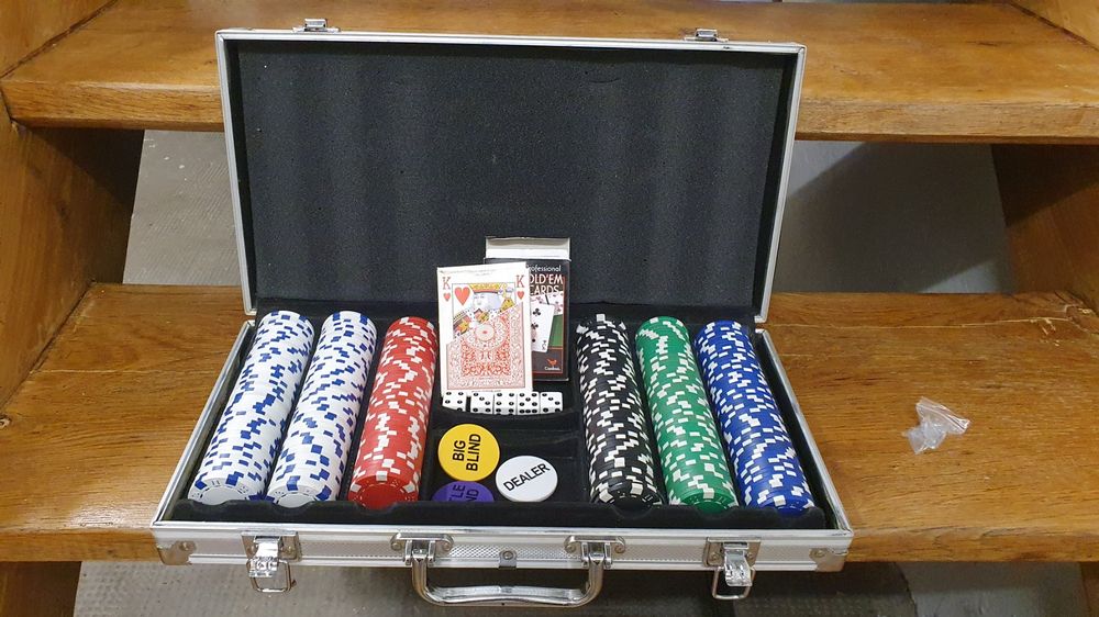 Pokerabend wie im echten Casino! Dieses GlanzHeim Poker Set bringt Profi-Feeling in dein Wohnzimmer. Im robusten Aluminiumkoffer findest du 300 Pokerchips (100 rot, 50 orange, 50 blau, 50 grün, 50 schwarz) mit aufgedruckten Werten - keine Verwechslungsgefahr! Dazu gibt's 2 Kartendecks, 5 Würfel, Dealer Button, Small und Big Blind. Das Highlight: Die 90x57cm Tischauflage verwandelt jeden Tisch in einen Pokertisch. Mit 2 Schlüsseln bleibt alles sicher verstaut. Perfekt für Jungsabende, Geburtstagsfeiern oder Turniere. Der Koffer misst 37x26x11cm - kompakt und transportfreundlich. Achtung: Enthält Kleinteile, nicht für kleine Kinder geeignet. Mach deine nächste Pokerrunde zum unvergesslichen Event! Alles dabei, was echte Poker-Profis brauchen.