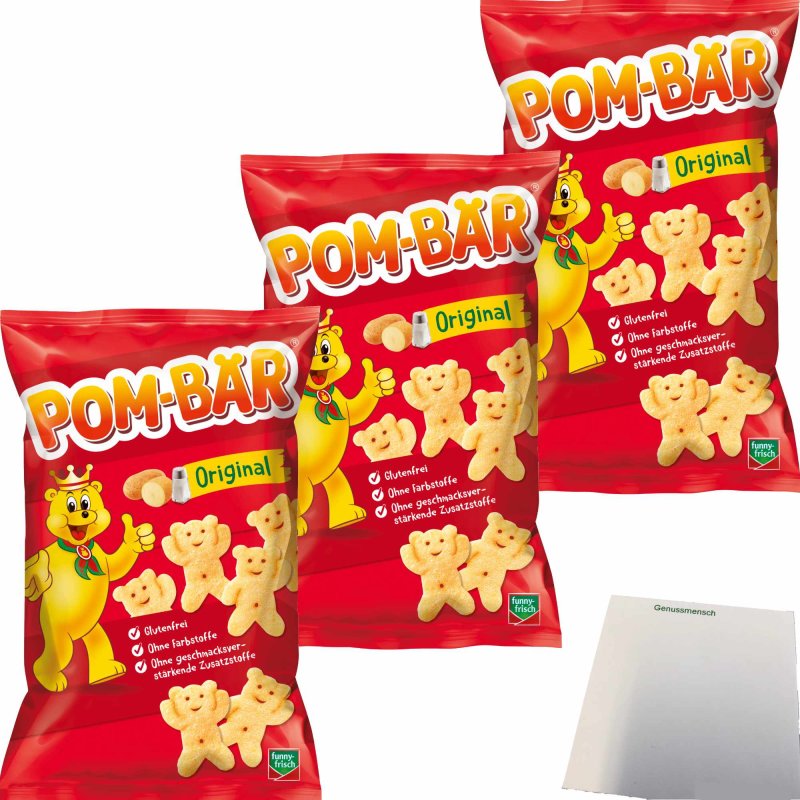 Pom-Bär - die kleinen knusprigen Helden in Bärenform! Dieses praktische 3er Pack von Funny Frisch ist perfekt für unterwegs, die Lunchbox oder einfach für gemütliche Filmabende. Jede Packung enthält 75g der leckeren Kartoffelsnacks, die nicht nur super schmecken, sondern auch noch glutenfrei sind.\n\nDie luftig-leichten Pom-Bär sind bei Groß und Klein gleichermaßen beliebt. Sie schmelzen quasi auf der Zunge und haben diesen unverwechselbaren Geschmack, den einfach jeder liebt. Perfekt als kleiner Snack für zwischendurch oder für die nächste Party.\n\nUnd das Beste: Sie sind nicht nur lecker, sondern auch praktisch verpackt. Die einzelnen Beutel lassen sich leicht öffnen und wieder verschließen, damit die Knusprigkeit erhalten bleibt. Einfach reinbeißen und genießen!\n\nEgal ob für deine Kinder, für Gäste oder einfach für dich selbst - mit diesem 3er Pack bist du immer bestens versorgt. Die kleinen Bären machen einfach immer eine gute Figur und schmecken einfach unwiderstehlich lecker!