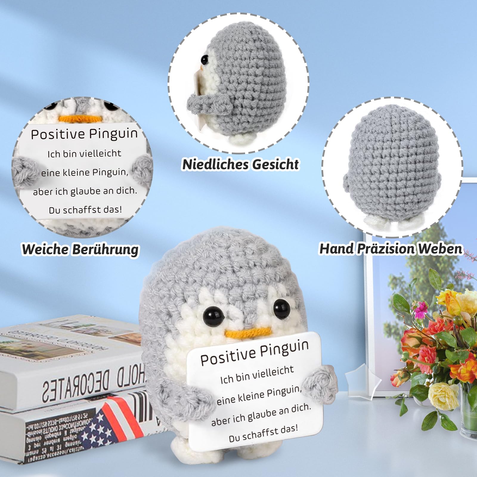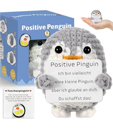 Oh wie süß! Diese handgestrickten Pinguine sind einfach nur niedlich und machen sofort gute Laune. Im Set bekommst du zwei verschiedene Pinguine (in Schwarz und Grau) plus einen herzförmigen Glücksbringer mit aufmunternder Gravur. Perfekt als kleine Aufmerksamkeit für Tage, an denen's mal nicht so läuft. \\n\\nDie Pinguine sind aus weicher Wolle und Baumwolle handgenäht, fühlen sich super kuschelig an und haben eine Mini-Karte mit positiven Botschaften dabei. Der Glücksbringer aus Edelstahl passt in jede Tasche - ein kleiner Begleiter für unterwegs. \\n\\nEgal ob für deine Freundin, den besten Kumpel, oder auch für dich selbst: Diese kleinen Kerlchen zaubern sofort ein Lächeln ins Gesicht. Du kannst sie auf den Schreibtisch stellen, neben's Kopfkissen legen oder einfach in der Jackentasche mitnehmen. Wenn mal wieder der Stress kommt, einfach den Pinguin drücken und durchatmen. Einfach ein tolles Geschenk voller positiver Energie für jeden Anlass!