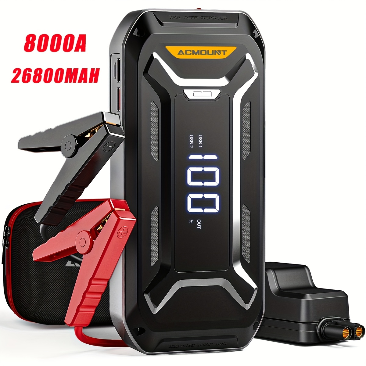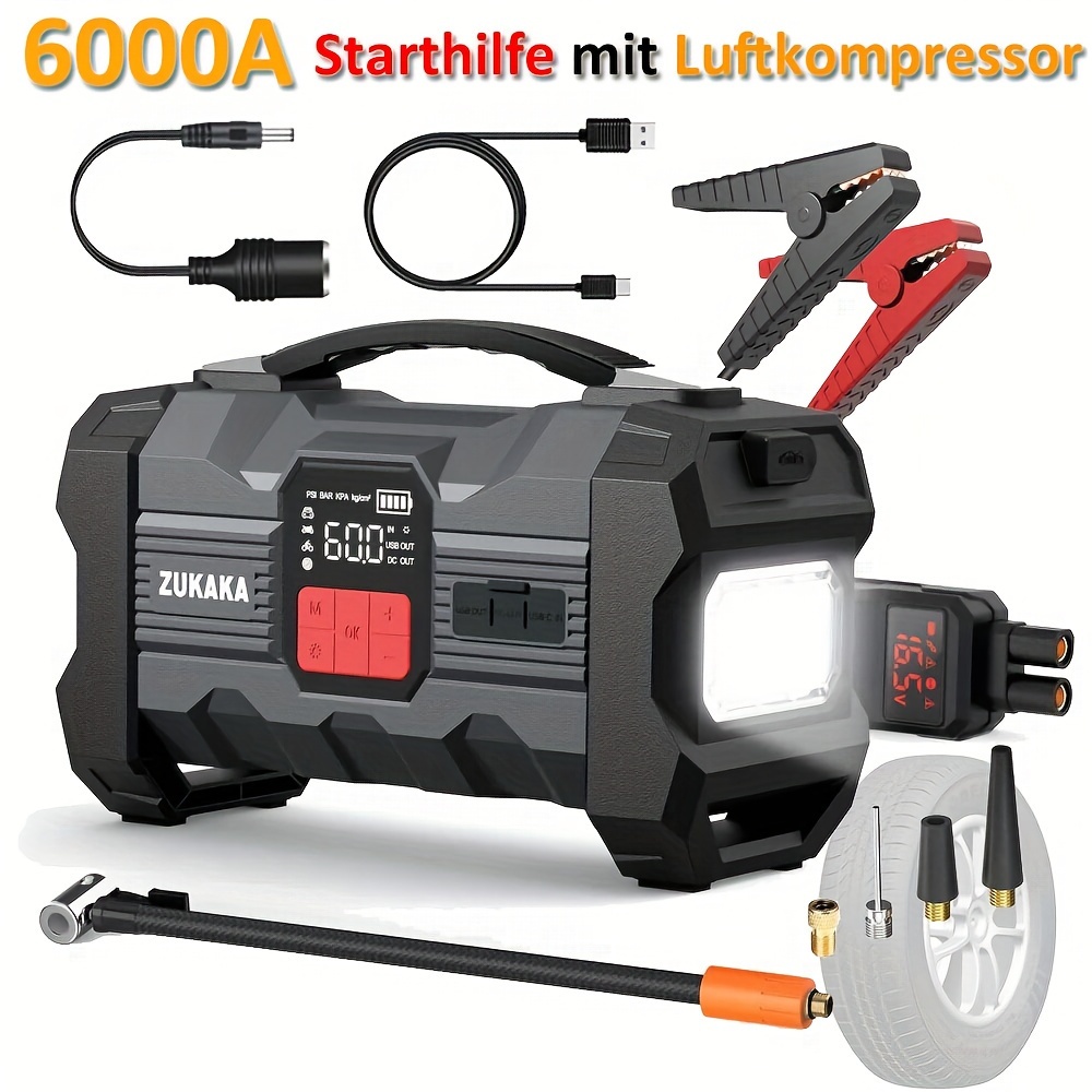 Die PGNOOGE Starthilfe Powerbank ist dein Retter in der Not! Mit 6000A Spitzenstrom und 26800mAh Kapazität startet sie alle 12V Benzinfahrzeuge und Diesel bis 10L Hubraum. Inklusive LED-Display für Batteriestatus, Taschenlampe mit 3 Modi und USB-Schnellladung für deine Geräte. 10 Sicherheitsfunktionen schützen vor Überladung, Kurzschluss und Verpolung. IP65 zertifiziert - staub- und spritzwassergeschützt. Perfekt für Auto, Motorrad, Boot, Wohnmobil. Im Lieferumfang: Starthilfegerät, intelligente Kabel, USB-C Kabel, Tasche. Nie wieder mit leerer Batterie stehen bleiben!