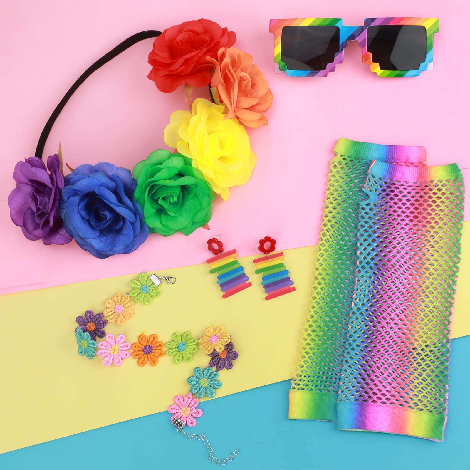 Komplettes Pride-Set mit 5 Teilen! Enthält: Regenbogen Haarschmuck, coole Sonnenbrille, bunte Handschuhe, stylisches Bandana und 6 Gesichts-Malstifte. Alles in leuchtenden Regenbogenfarben mit süßen Blumen-Mustern. Zeig deine Unterstützung für die LGBTQ+ Community! Aus hochwertigen Materialien - super bequem und langlebig. Perfekt für Pride-Paraden, Regenbogen-Partys, Karneval oder Geburtstage. Egal ob jung oder alt - damit machst du was her! Zeig, dass du stolz bist auf Vielfalt und Liebe!