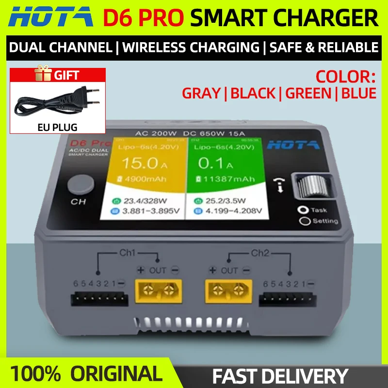 Das ultimative Ladegerät für deine RC-Modelle! Der HOTA D6 Pro ist ein echtes Powerpaket mit dualer Lade Funktion und bis zu 15A Ladestrom. Mit dem großen IPS-Bildschirm siehst du alle wichtigen Daten auf einen Blick - farbecht und aus jedem Winkel gut ablesbar. Kompatibel mit so gut wie allen Akku-Typen: LiHv/LiF/Lilon (1-6S), NiZn/NiCd/NiMH (1-16S), Blei-Säure (2-24V) und sogar Smart-Batteries. Die Ladeleistung ist beeindruckend: DC 325W und AC 200W, mit Stromverteilung zwischen den Kanälen. Deine Akkus sind immer sicher: Überhitzungsschutz, Verpolungsschutz, Kurzschlussschutz und vieles mehr sorgen für maximale Sicherheit. Mit den Maßen 108x105x76 mm ist das Ladegerät kompakt, aber trotzdem voller Power. Perfekt für RC-Autos, Boote, Drohnen - einfach alles, was mit Akkus betrieben wird. Das Menü ist in Deutsch und Englisch verfügbar, und der XT60 Stecker passt zu den meisten RC-Modellen. Wenn du ernsthaft in die RC-Welt einsteigen willst, ist dieses Ladegerät ein absolutes Muss!