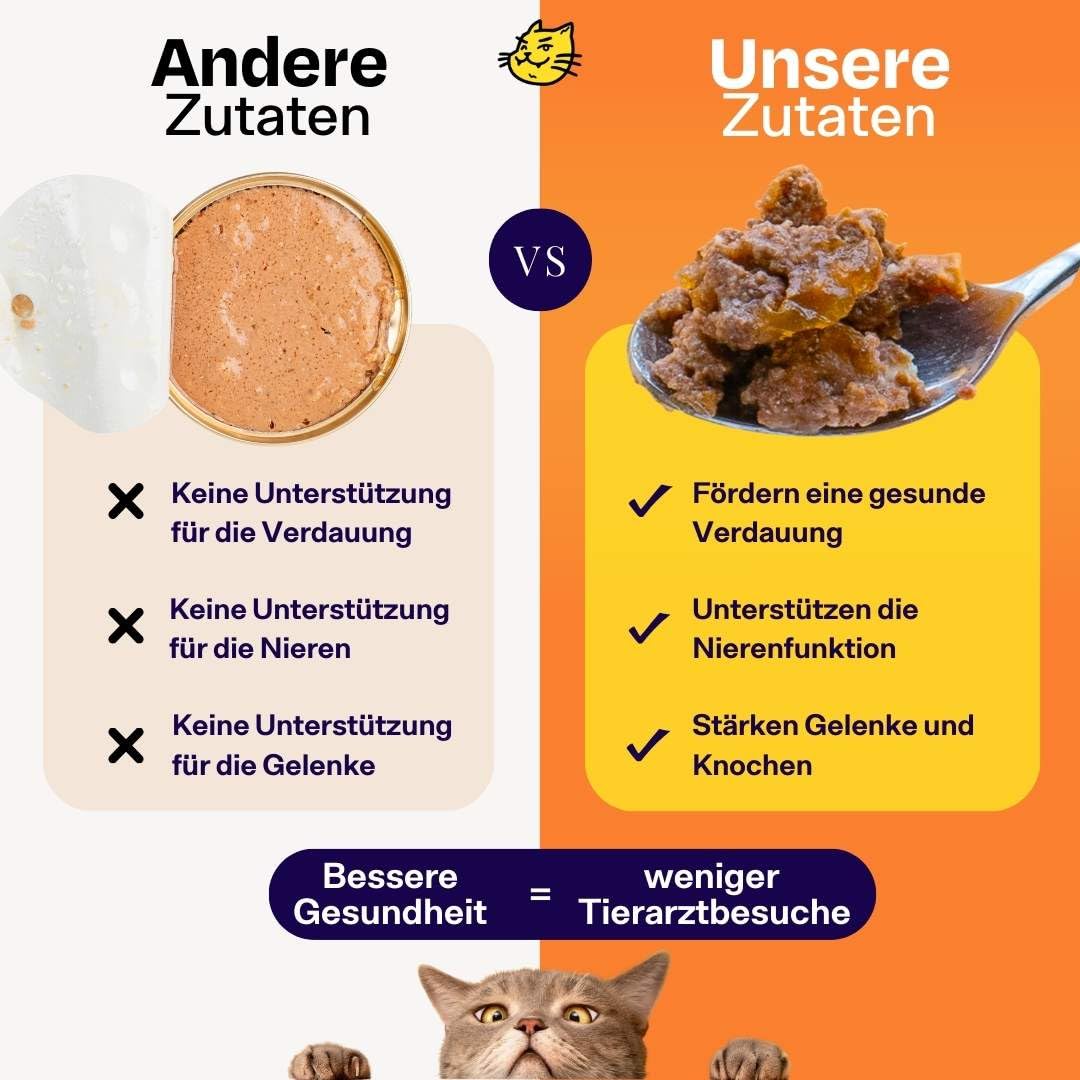 Deine Katze wird verrückt sein nach diesem Probier-Pack! Enthalten sind 6x85g Nassfutter in 3 Sorten (Huhn, Rind, Huhn & Forelle), 2x400g Trockenfutter (Huhn und Lachs) und 50g gefriergetrockneter Huhn-Snack. Alles komplett getreidefrei und ohne Zucker - nur das Beste für deinen Stubentiger! Mit hohem Fleischanteil und wertvollen Prä- und Probiotika für eine gesunde Verdauung. Die spezielle Mischung aus Löwenzahn, Algenöl und Distelöl stärkt das Immunsystem und liefert wichtige Omega-3-Fettsäuren, Vitamin B und C. Perfekt für Katzen jeden Alters und aller Rassen, besonders bei empfindlichem Magen. So findest du ganz einfach heraus, was deiner Katze am besten schmeckt. Einfach nach Fütterungsempfehlung auf der Packung geben und zusehen, wie dein kleiner Tiger genießt!