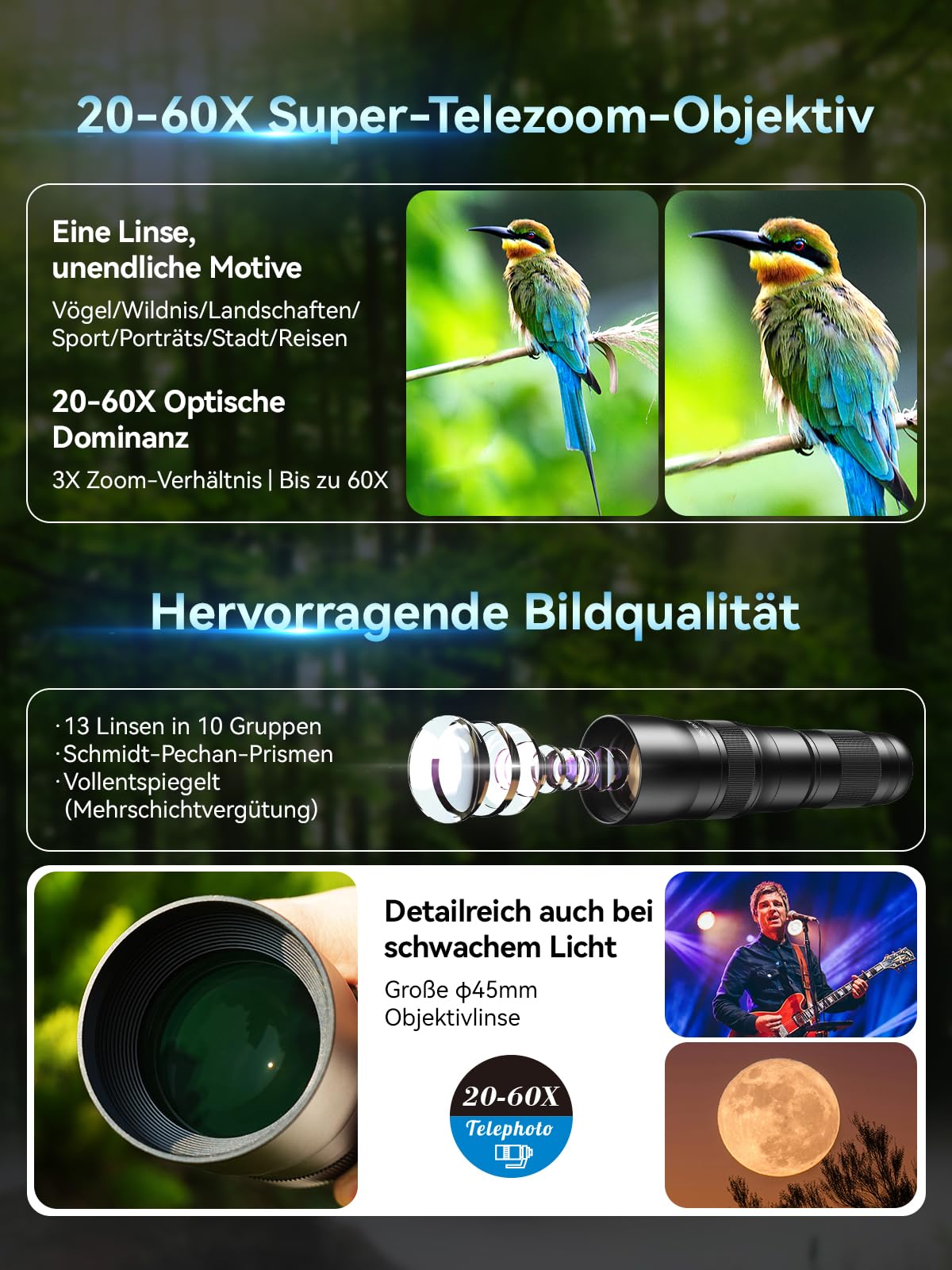 Entdecke die Natur ganz nah! Das APEXEL Spektiv mit 20-60x Vergrößerung bringt Vögel und Wildtiere bis auf 480-1440mm heran. Mit 13 Linsen in 10 Gruppen für gestochen scharfe Bilder. Integrierter Smartphone-Adapter passt für 99% aller Handys - mach einfach Fotos und teile sie sofort! Nur 741g leicht und kompakt - perfekt für unterwegs. Inklusive Stativring für ruhige Aufnahmen. 45mm Objektivöffnung und Schmidt-Pechan-Prisma für beste Lichtausbeute. Ob Vögel, Mond oder Landschaften - dieses Spektiv macht jeden Ausflug zum Erlebnis!