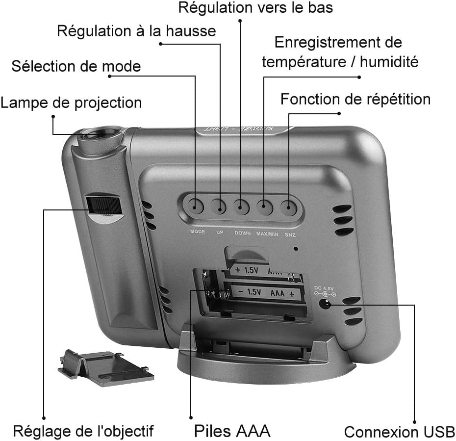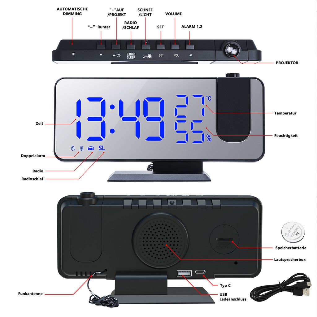 • Projektion: 180° drehbar • Funktionen: Temperatur, Luftfeuchtigkeit • Wecker: 2 unabhängig • Strom: USB/Batterie • Display: LCD • Für: Schlafzimmer, Büro