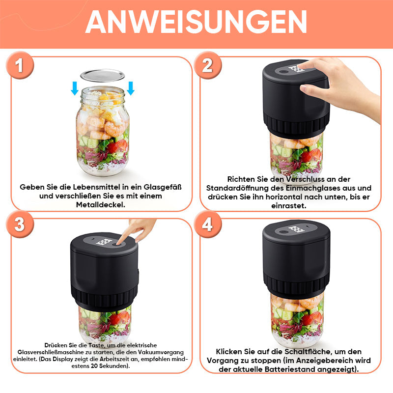 Mach deine Lebensmittel länger haltbar mit diesem praktischen Vakuum-Glasdeckel Set! Enthalten sind 9 bunte Deckel (ca. 8,5 cm) und eine handliche Pumpe (24 cm). Einfach den Deckel aufs Glas setzen, die Pumpe anschließen und ein paar Mal pumpen - schon ist alles luftdicht verschlossen. Perfekt für Vorräte, Meal Prep oder zum Mitnehmen von Snacks. Die bunten Deckel helfen dir, verschiedene Lebensmittel farblich zu sortieren. Hergestellt aus hochwertigem ABS-Kunststoff, geruchlos und super einfach zu reinigen. Ideal für Camping, Picknicks oder die Vorratskammer zu Hause. So bleiben Nüsse, Müsli, Trockenfrüchte oder Gewürze länger frisch und aromatisch. Kein Auslaufen, kein Eindringen von Feuchtigkeit oder Gerüchen. Das Set ist wiederverwendbar und spart dir jede Menge Plastikverpackungen. Einfach genial für alle, die Wert auf frische Lebensmittel und Nachhaltigkeit legen! Ein Must-Have für jede moderne Küche.