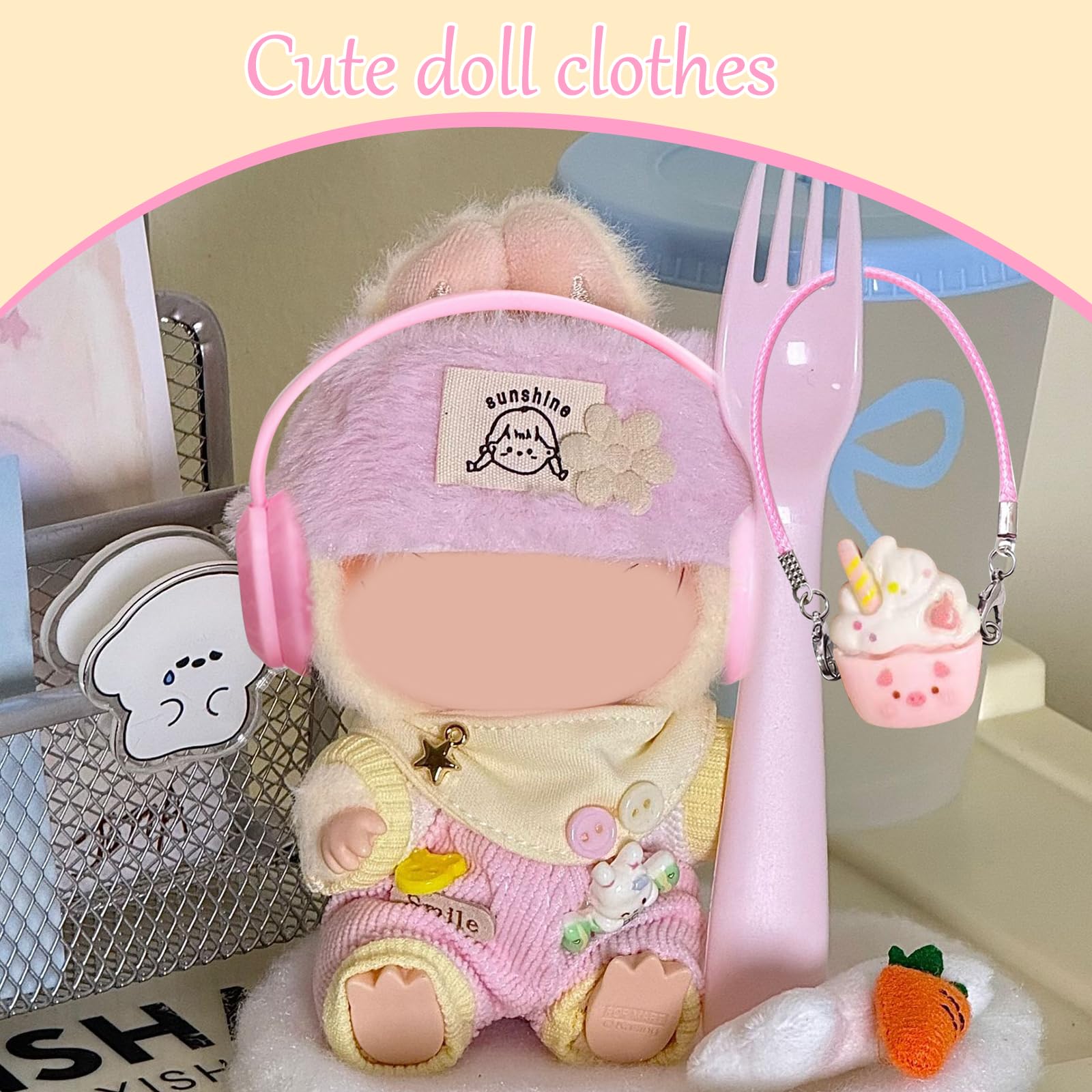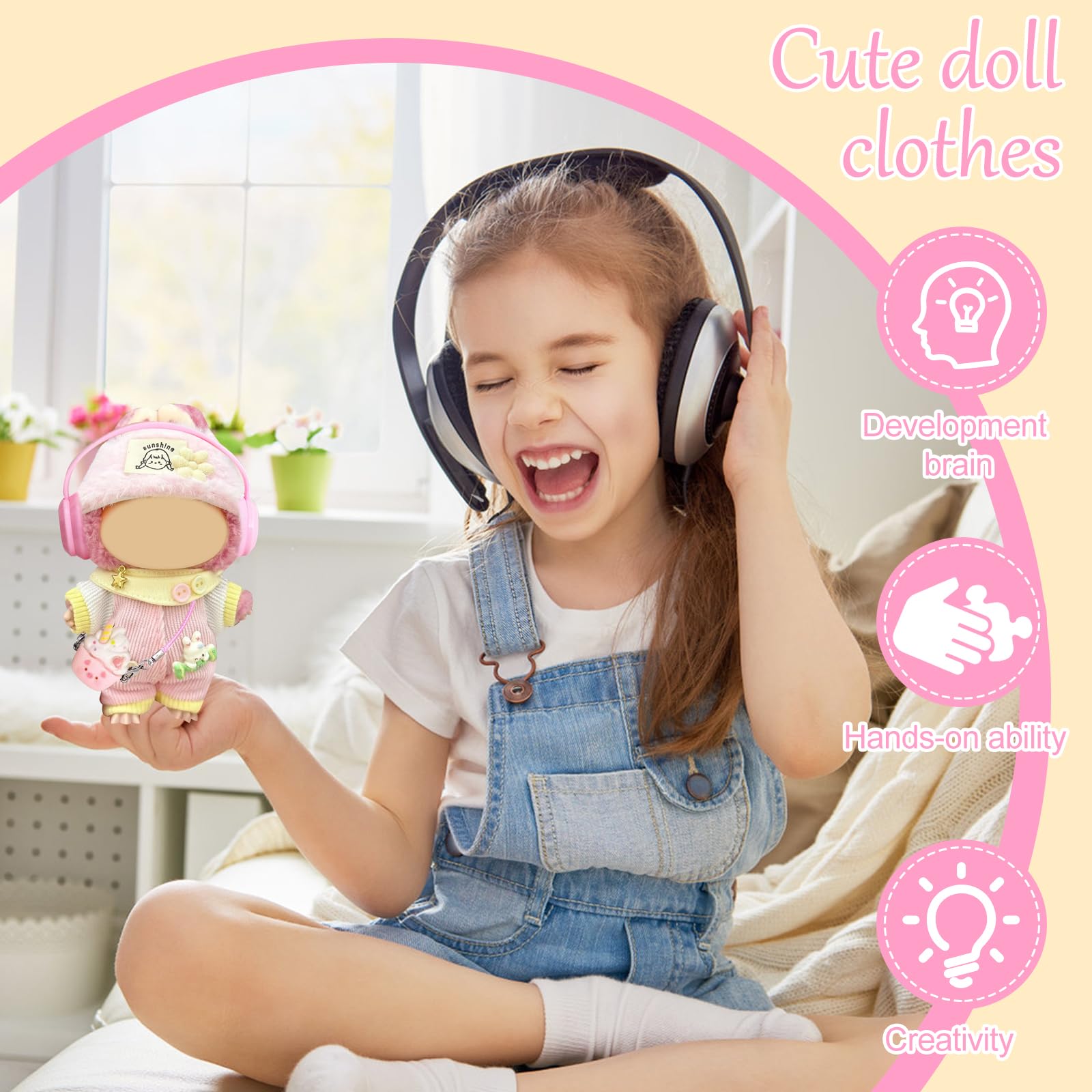 Style deine Plüsch-Figur! Dieses süße Outfit-Set passt perfekt für 17cm große Puppen wie Labubu und andere Sammlerfiguren. Enthalten sind: Jumpsuit, Stirnband, Schal, Tasche und niedliche Kopfhörer. Alles aus weicher Baumwolle, angenehm auf der Haut und waschbar. Die elastischen Öffnungen machen das An- und Ausziehen super einfach. Perfekt zum Fotografieren, Sammeln oder einfach zum Spielen. Mach deine Puppe zum Fashion-Star und wechsle die Looks nach Lust und Laune. Ein ideales Geschenk für Kinder und erwachsene Sammler gleichermaßen. Ohne Puppe - nur die Kleidung!