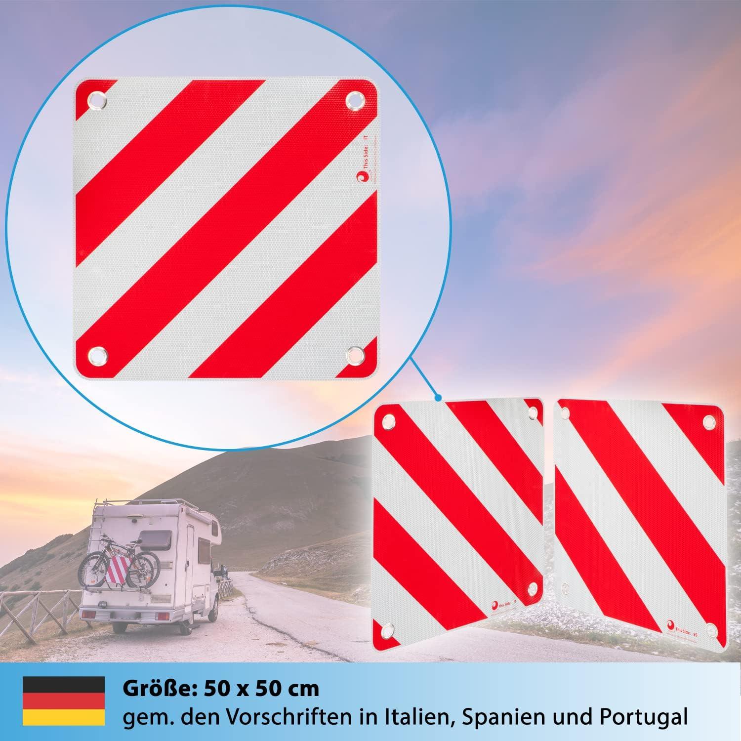 Sicher in den Süden! Diese CONTEC Warntafel ist Pflicht für Heckträger in Italien, Spanien und Portugal. Aus robustem Aluminium mit Kantenschutz - hält jedem Wetter stand. Maße 50x50cm für perfekte Sichtbarkeit in Bergen und bei Dunkelheit. Das clevere 2in1 Design: Einfach wenden und du hast die richtige Seite für Italien ODER Spanien/Portugal. Inklusive 4 elastischen Bändern (60cm) und 2 Spanngurten (1,5m + 3m). Einfach am Fahrradträger befestigen und legal unterwegs sein. Die roten Reflexstreifen sorgen für zusätzliche Sicherheit. Perfekt für Wohnmobile, Wohnwagen und Autos mit Heckträgern. Einfach montieren und sorgenfrei in den Urlaub fahren!