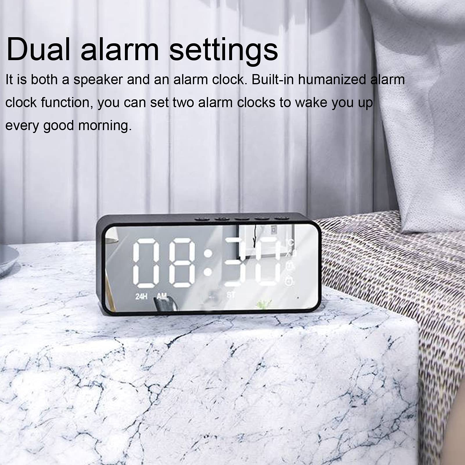 Dieser Wecker ist echt vielseitig! Stell dir vor: Du wirst morgens von deiner Lieblingsmusik geweckt, siehst auf dem großen Spiegeldisplay sofort die Uhrzeit und Temperatur, und das ganze mit coolem RGB-Licht. Der integrierte Bluetooth-Lautsprecher bringt nicht nur Musik, sondern hat auch ein gutes Mikrofon für Freisprechanrufe. Mit 5W Treibern klingt der Sound richtig fett - ob Radio, Musik von der SD-Karte oder per AUX-Eingang. Zwei Wecker kannst du einstellen, falls du mal länger schlafen willst. Praktisch: Lädt per modernem USB-C und hat einen 1200mAh Akku. Perfekt fürs Schlafzimmer, aber auch für Kinder super geeignet. Einfach anschließen und loslegen - mehr Komfort geht kaum! Das Gerät ist übrigens nur 5V/1A und unterstützt SD-Karten bis 512GB. Der Sound ist kristallklar und die Bedienung total intuitiv. Egal ob zum Musikhören, Radio oder als Wecker - dieses Teil erledigt alles in einem!