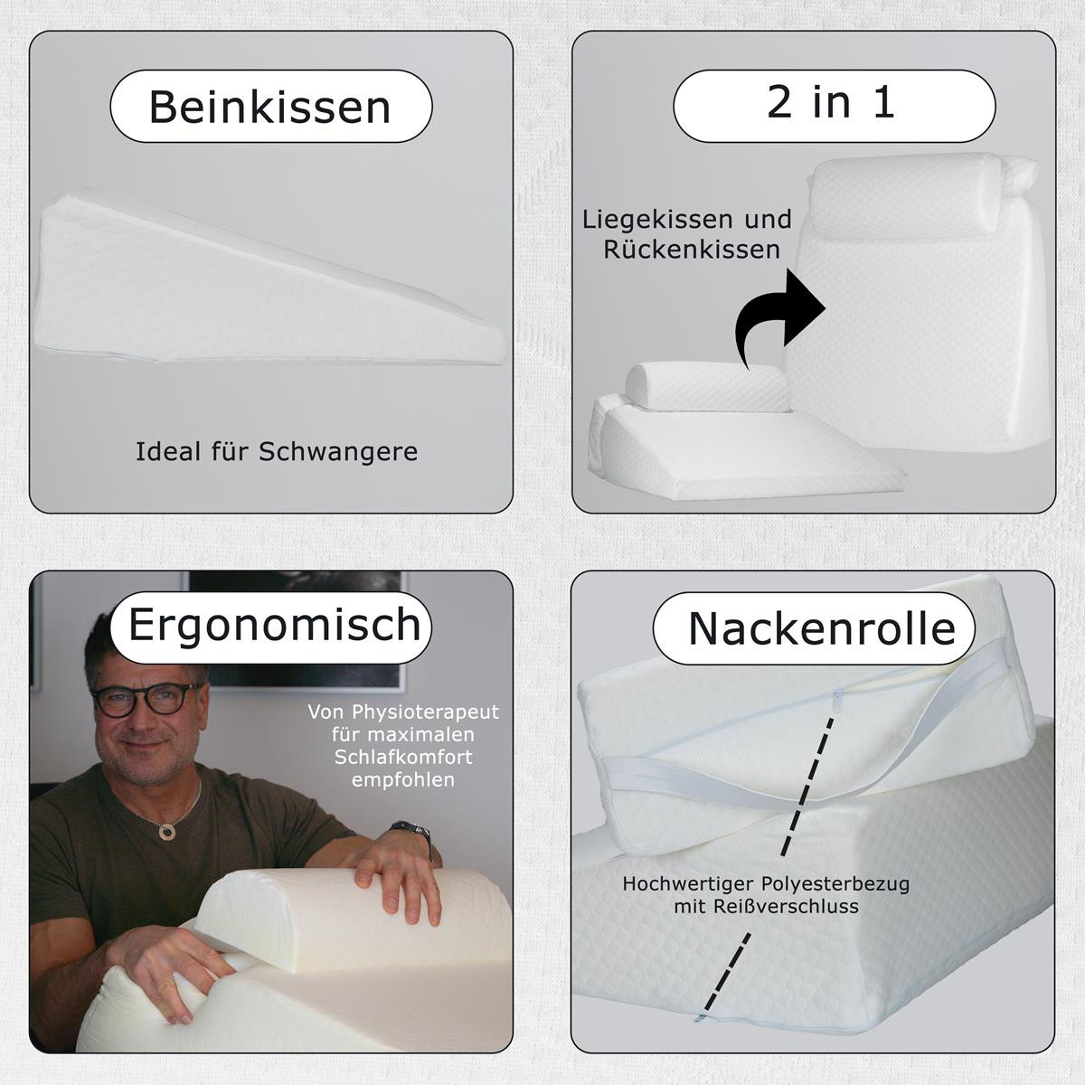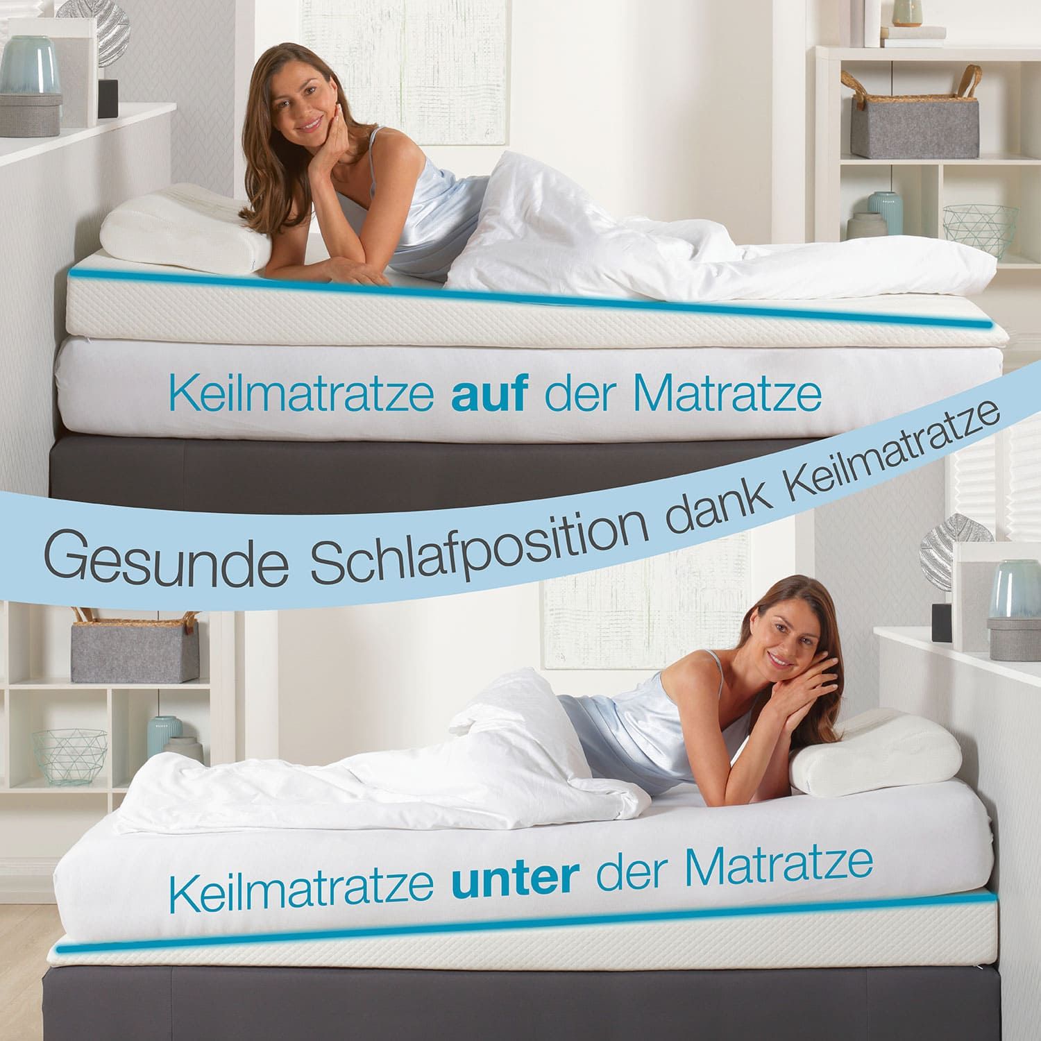 Endlich wieder durchschlafen! Unser Velara Keilkissen mit cleverem 2-Schicht-System kombiniert festen Komfortschaum mit kuscheligem Memory Foam. Perfekt bei Reflux, Schlafapnoe oder Rückenschmerzen. Der Keil ist 90 cm breit und rutscht dank Anti-Rutsch-Unterseite nicht weg - egal ob auf Matratze, Boxspringbett oder Sofa. Der superweiche Bezug ist bei 40°C waschbar und hat sogar einen praktischen Tragegriff. Hergestellt in Europa, Oeko-Tex zertifiziert und geruchsneutral. Für erholsame Nächte und einen erholten Rücken!
