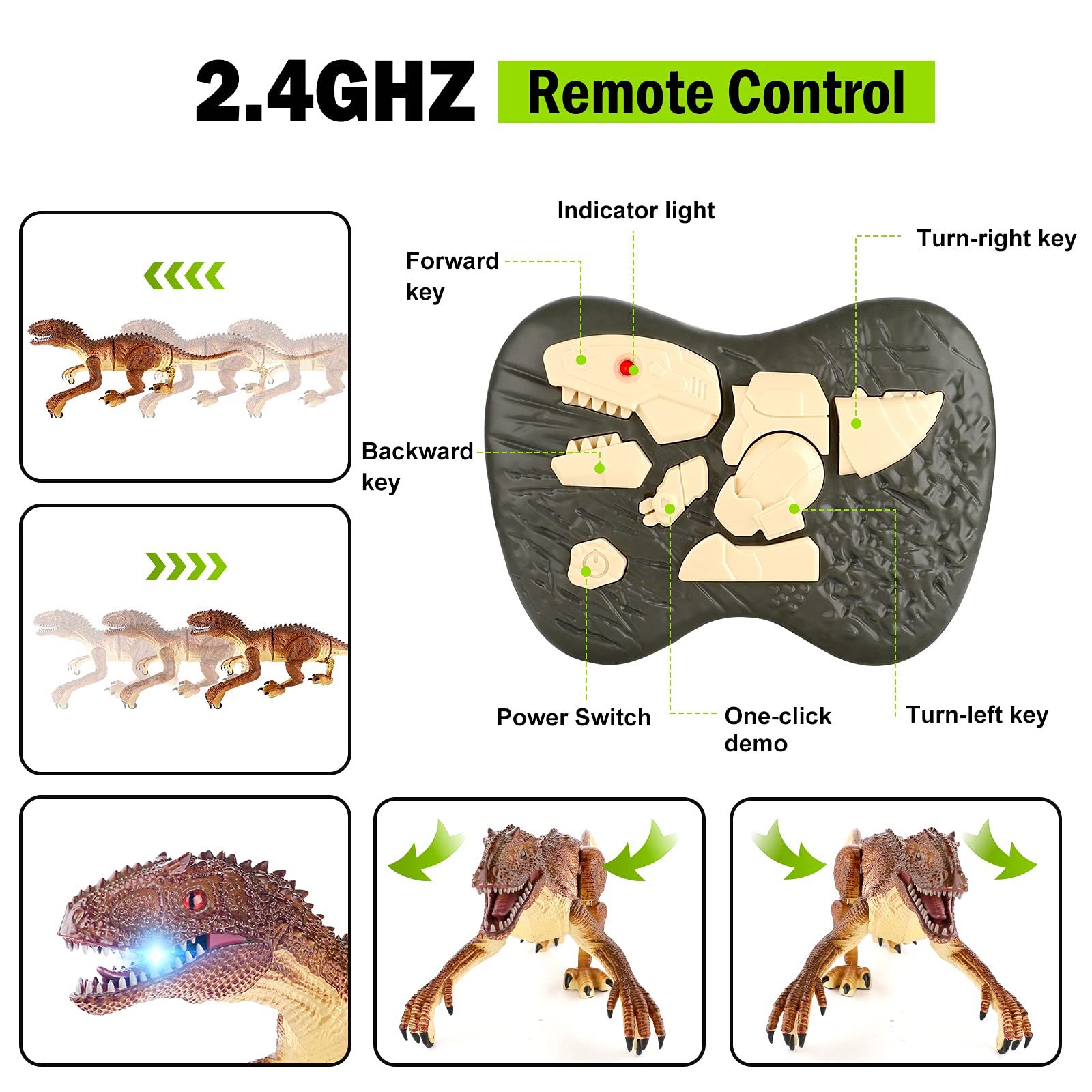 Achtung, der T-Rex ist los! Dieser ferngesteuerte Dinosaurier bringt actionreichen Spaß für Kinder ab 3 Jahren. Er läuft, dreht sich, brüllt, wedelt mit dem Schwanz und leuchtet sogar - einfach mega realistisch! Mit 2,4 GHz Fernsteuerung für stabiles Signal, ohne Störungen. Der 1200mAh Akku wird per USB aufgeladen für lange Spielzeit. Besonders cool: Vorderbeine und Schwanz sind abnehmbar, was das Spiel noch interessanter macht. Aus sicherem ABS-Material ohne scharfe Kanten. Perfektes Geschenk für kleine Dino-Fans - ob zu Weihnachten, Geburtstag oder einfach so. Vorhang auf für die Urzeit!