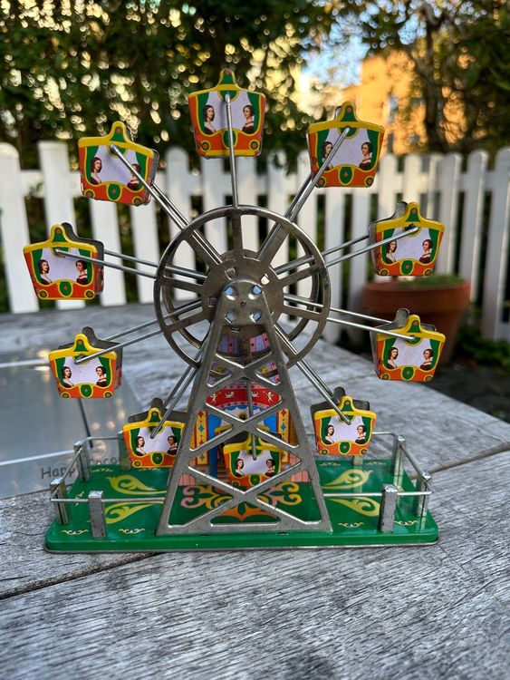 So viel Nostalgie! Dieses süße Riesenrad aus Blech ist ein echter Hingucker. Einfach aufziehen und zuschauen wie es sich dreht - mit Musik! Maße: 21x9,5x22cm - perfekt für die Vitrine oder als Deko. Im Retro-Design das Erinnerungen weckt. Aus umweltfreundlichen Materialien - unbedenklich für Kinder. Aber Achtung: Ist ein Sammlerstück und kann kleine Kratzer haben. Beim Aufziehen nicht zu fest drehen - 1-3 Umdrehungen reichen. Nicht rückwärts aufziehen! Super als Geschenk für Erwachsene die sich an ihre Kindheit erinnern wollen. Auch toll fürs Büro oder die Bar. Bringt gute Laune und lädt zum Staunen ein!