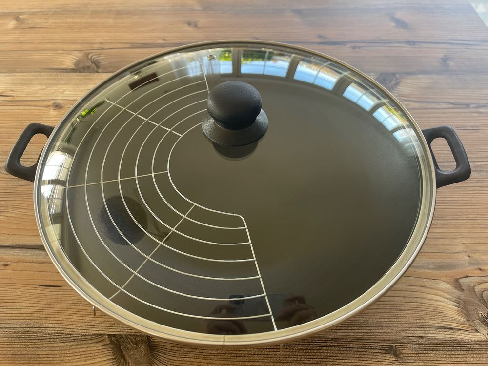 Boah, das ist mal ein echter Profi-Wok! Der 50cm Koloss kommt direkt aus der chinesischen Gastronomie und ist made für alle, die's ernst meinen mit dem Kochen. Aus robustem Carbonstahl gebaut, hat der Wok zwei stabile Henkel und eine runde Form, die sich super zum Braten, Dünsten, Frittieren und Dämpfen eignet. Wichtig: Vor dem ersten Gebrauch musst du ihn gründlich reinigen und einbrennen - am besten draußen oder unter dem Dunstabzug, weil's ganz schön qualmen kann. Achtung: Nicht für Ceran oder Induktion geeignet! Dafür ist er ein absoluter Allrounder in der Küche und hält ewig. Perfekt für alle, die asiatisch kochen lieben oder einfach gerne in großen Portionen schnippeln. Mit 14 Litern Volumen und 15 cm Wannentiefe passt da echt viel rein - ideal für Familienfeiern oder Meal Prep. Einmal richtig eingebrannt, wird der Wok dein treuer Küchenbegleiter!