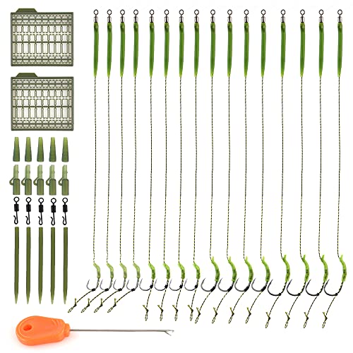Na, angeln geht heute auf Karpfen? Dieses komplette Set mit 20 Haar-Rigs von Luroad macht dich zum Profi! Enthalten sind Haken in verschiedenen Größen: 5x Größe 4, 5x Größe 6, 5x Größe 8 und 5x Größe 10 - damit bist du für jeden Fisch gewappnet. Die Haken aus Carbonstahl mit Teflon-Beschichtung sind super scharf und rostfrei. Das geflochtene Tarngeflecht hält bis zu 10,9 kg aus! Im Set dabei: 3 Boilie-Stopper und eine Stringer-Nadel. Alles bereits fertig montiert - einfach auspacken und losangeln! Perfekt für Anfänger, die nicht selbst binden wollen, und für Profis, die Zeit sparen möchten. Ob Süß- oder Salzwasser, mit diesen Rigs hast du die besten Chancen auf dicke Karpfen. Einfach Köder anbringen, auswerfen und auf den Biss warten - viel Erfolg!