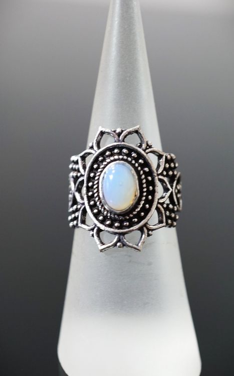Dieser wunderschöne Mondstein-Ring von MATERIA by Matthias Wagner vereint keltisches Design mit der magischen Anmutung des Mondsteins. Aus 925er Sterling Silber gefertigt, zeigt der Ring einen natürlichen Mondstein im Cabochonschliff mit seinen charakteristischen weiß-transparenten Schimmer und individuellen Einschlüssen - jedes Stück ein Unikat! Der Ringkopf ist 9mm breit, die Ringschiene verläuft von 1,5mm bis 6mm. Der Mondstein misst 7x5mm und das Gesamtgewicht beträgt ca. 1,8g. Geliefert in Größe 57 (18,1mm Durchmesser) - perfekt für die meisten Damenhände. Mit Anlaufschutz behandelt, behält der Ring lange Zeit seinen schönen Glanz. Verpackt in einer eleganten MATERIA Schmuckschachtel - ideal als Geschenk zur Hochzeit, zum Geburtstag, zu Weihnachten oder einfach als Belohnung für dich selbst. Ein zeitloses Schmuckstück, das durch seine zarte Eleganz besticht und zu besonderen wie auch alltäglichen Anlässen getragen werden kann.